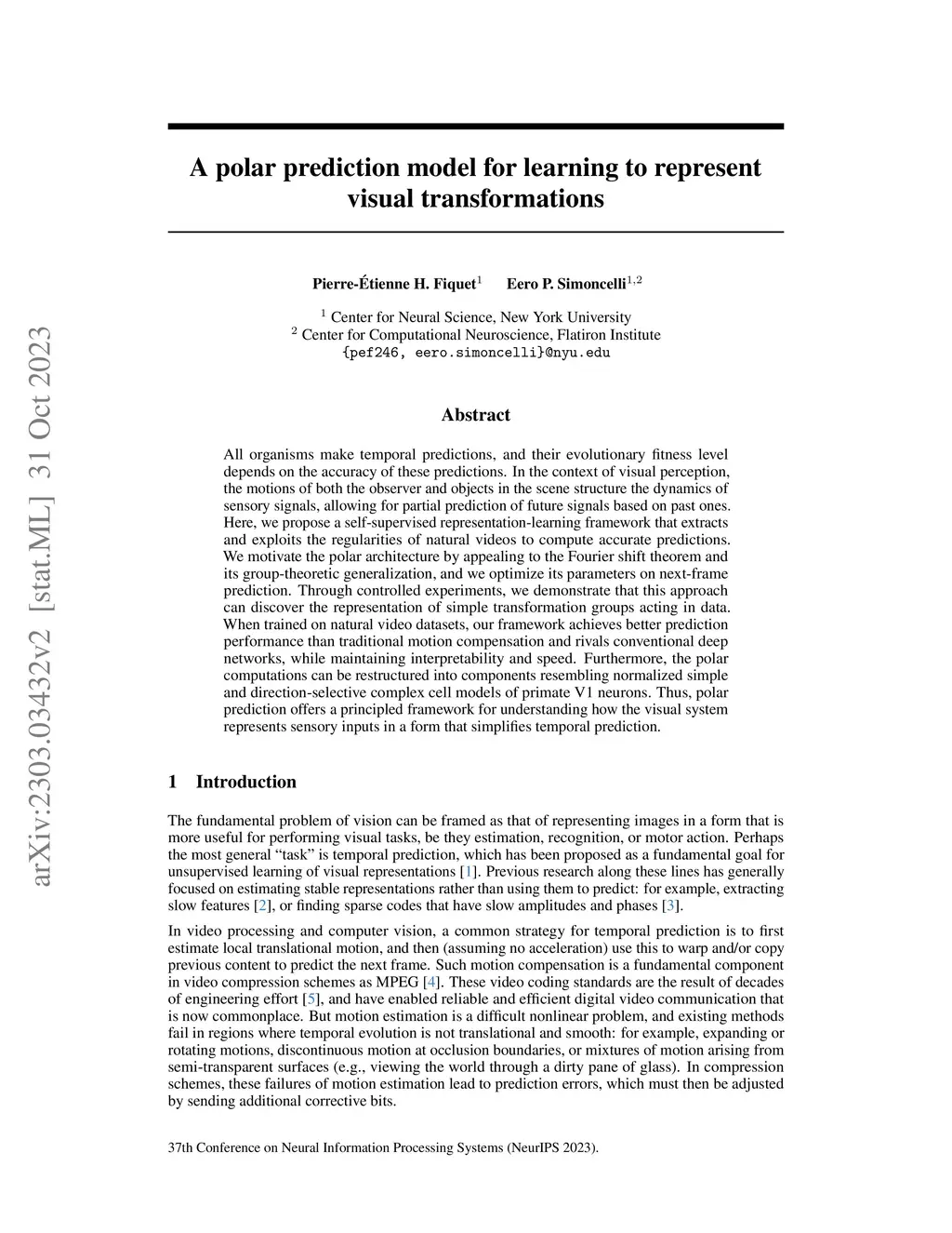 All organisms make temporal predictions, and their evolutionary fitness level depends on the accuracy of these predictions. In the context of visual perception, the motions of both the observer and objects in the scene structure the dynamics of sensory signals, allowing for partial prediction of future signals based on past ones. Here, we propose a self-supervised representation-learning framework that extracts and exploits the regularities of natural videos to compute accurate predictions. We motivate the polar architecture by appealing to the Fourier shift theorem and its group-theoretic generalization, and we optimize its parameters on next-frame prediction. Through controlled experiments, we demonstrate that this approach can discover the representation of simple transformation groups acting in data. When trained on natural video datasets, our framework achieves better prediction performance than traditional motion compensation and rivals conventional deep networks, while maintaining interpretability and speed. Furthermore, the polar computations can be restructured into components resembling normalized simple and direction-selective complex cell models of primate V1 neurons. Thus, polar prediction offers a principled framework for understanding how the visual system represents sensory inputs in a form that simplifies temporal prediction.
