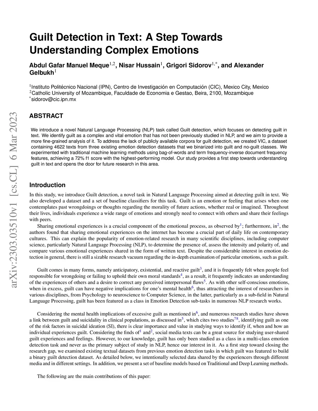 We introduce a novel Natural Language Processing (NLP) task called Guilt detection, which focuses on detecting guilt in text. We identify guilt as a complex and vital emotion that has not been previously studied in NLP, and we aim to provide a more fine-grained analysis of it. To address the lack of publicly available corpora for guilt detection, we created VIC, a dataset containing 4622 texts from three existing emotion detection datasets that we binarized into guilt and no-guilt classes. We experimented with traditional machine learning methods using bag-of-words and term frequency-inverse document frequency features, achieving a 72% f1 score with the highest-performing model. Our study provides a first step towards understanding guilt in text and opens the door for future research in this area.