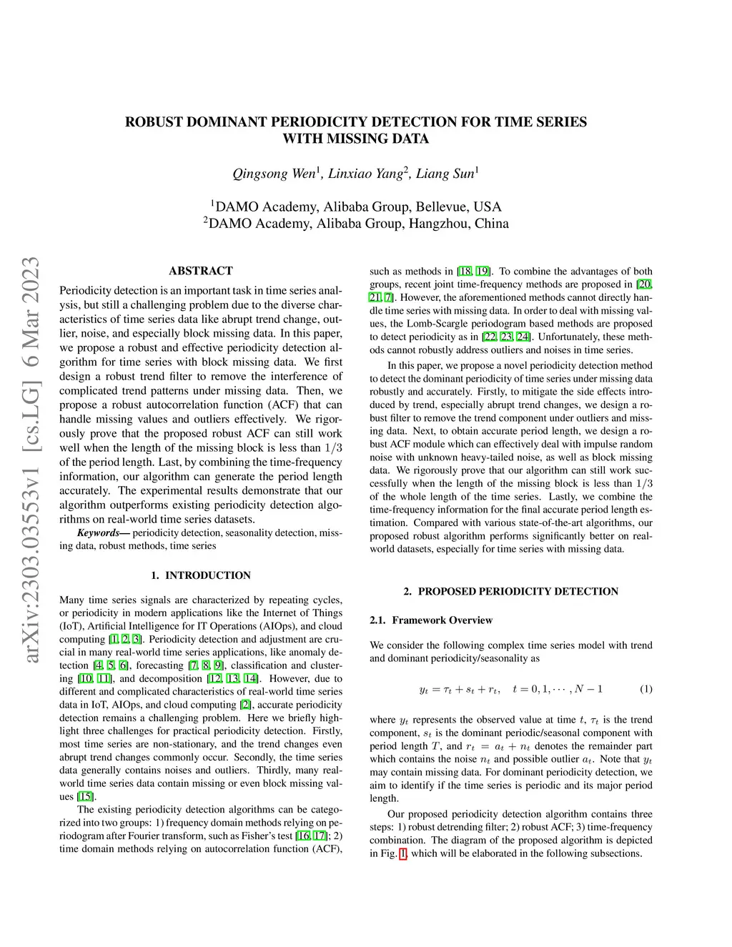 Periodicity detection is an important task in time series analysis, but still a challenging problem due to the diverse characteristics of time series data like abrupt trend change, outlier, noise, and especially block missing data. In this paper, we propose a robust and effective periodicity detection algorithm for time series with block missing data. We first design a robust trend filter to remove the interference of complicated trend patterns under missing data. Then, we propose a robust autocorrelation function (ACF) that can handle missing values and outliers effectively. We rigorously prove that the proposed robust ACF can still work well when the length of the missing block is less than of the period length. Last, by combining the time-frequency information, our algorithm can generate the period length accurately. The experimental results demonstrate that our algorithm outperforms existing periodicity detection algorithms on real-world time series datasets.