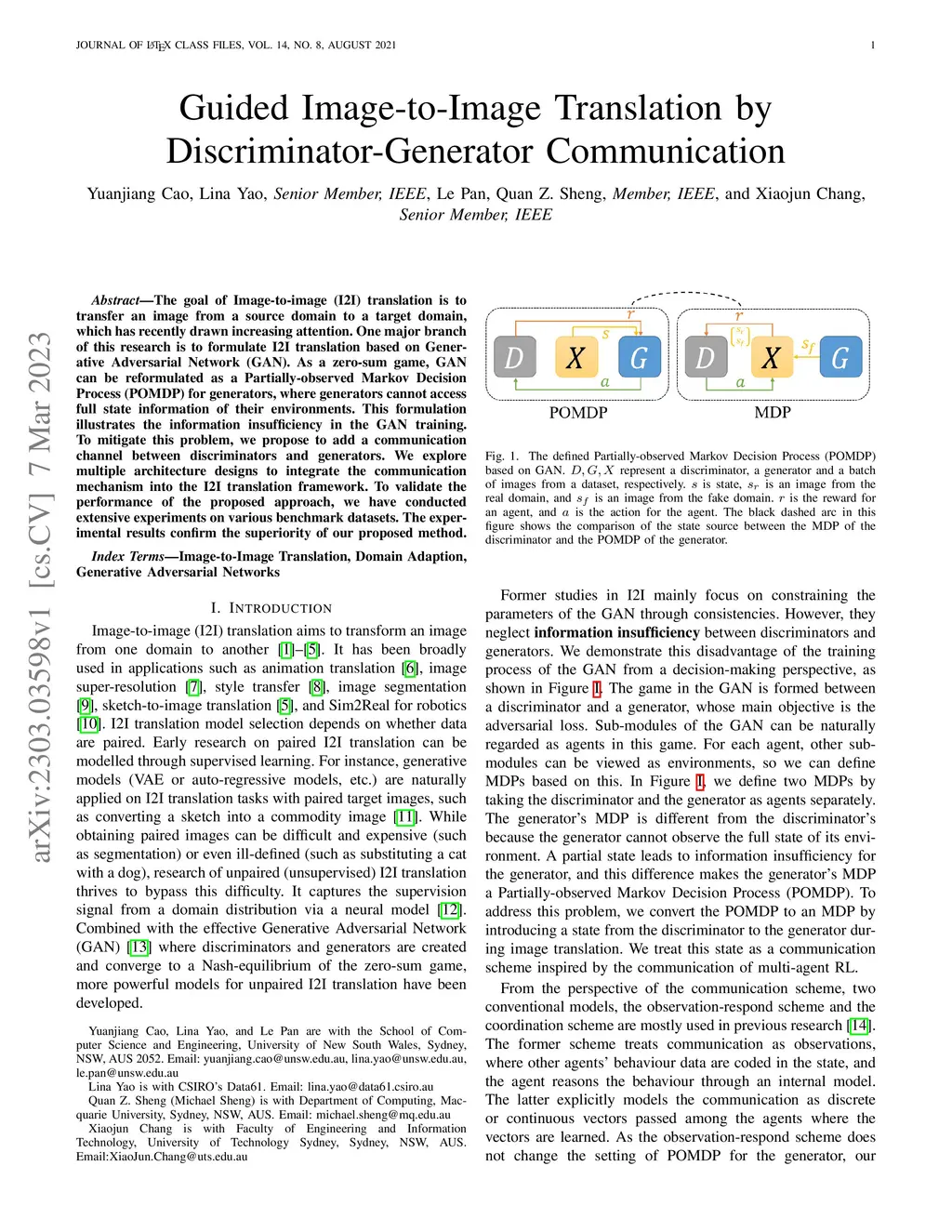 The goal of Image-to-image (I2I) translation is to transfer an image from a source domain to a target domain, which has recently drawn increasing attention. One major branch of this research is to formulate I2I translation based on Generative Adversarial Network (GAN). As a zero-sum game, GAN can be reformulated as a Partially-observed Markov Decision Process (POMDP) for generators, where generators cannot access full state information of their environments. This formulation illustrates the information insufficiency in the GAN training. To mitigate this problem, we propose to add a communication channel between discriminators and generators. We explore multiple architecture designs to integrate the communication mechanism into the I2I translation framework. To validate the performance of the proposed approach, we have conducted extensive experiments on various benchmark datasets. The experimental results confirm the superiority of our proposed method.