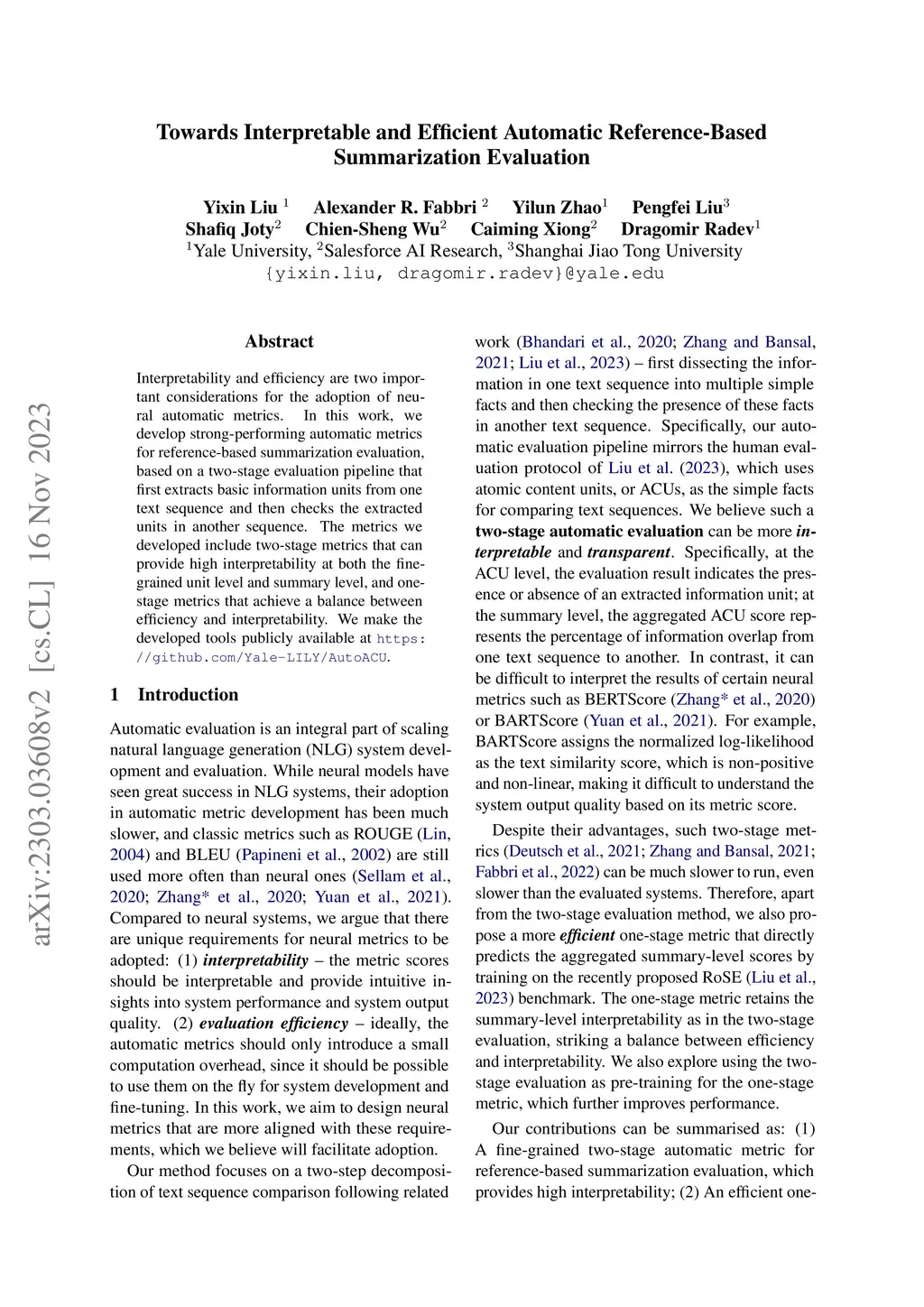 Interpretability and efficiency are two important considerations for the adoption of neural automatic metrics. In this work, we develop strong-performing automatic metrics for reference-based summarization evaluation, based on a two-stage evaluation pipeline that first extracts basic information units from one text sequence and then checks the extracted units in another sequence. The metrics we developed include two-stage metrics that can provide high interpretability at both the fine-grained unit level and summary level, and one-stage metrics that achieve a balance between efficiency and interpretability. We make the developed tools publicly available at https://github.com/Yale-LILY/AutoACU.