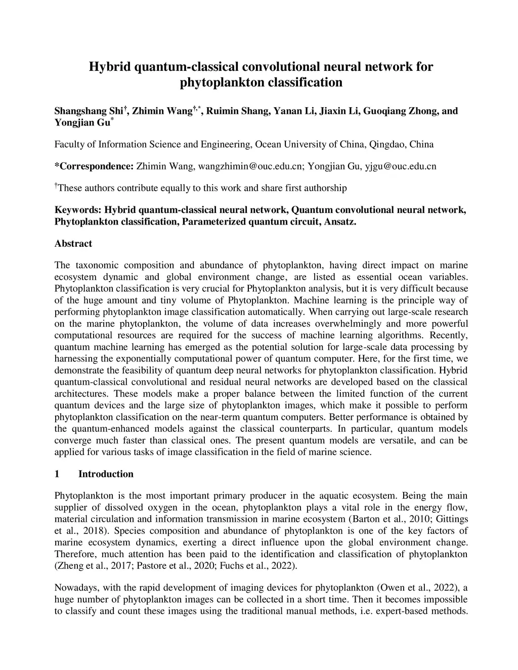 Hybrid quantum-classical convolutional neural network for phytoplankton