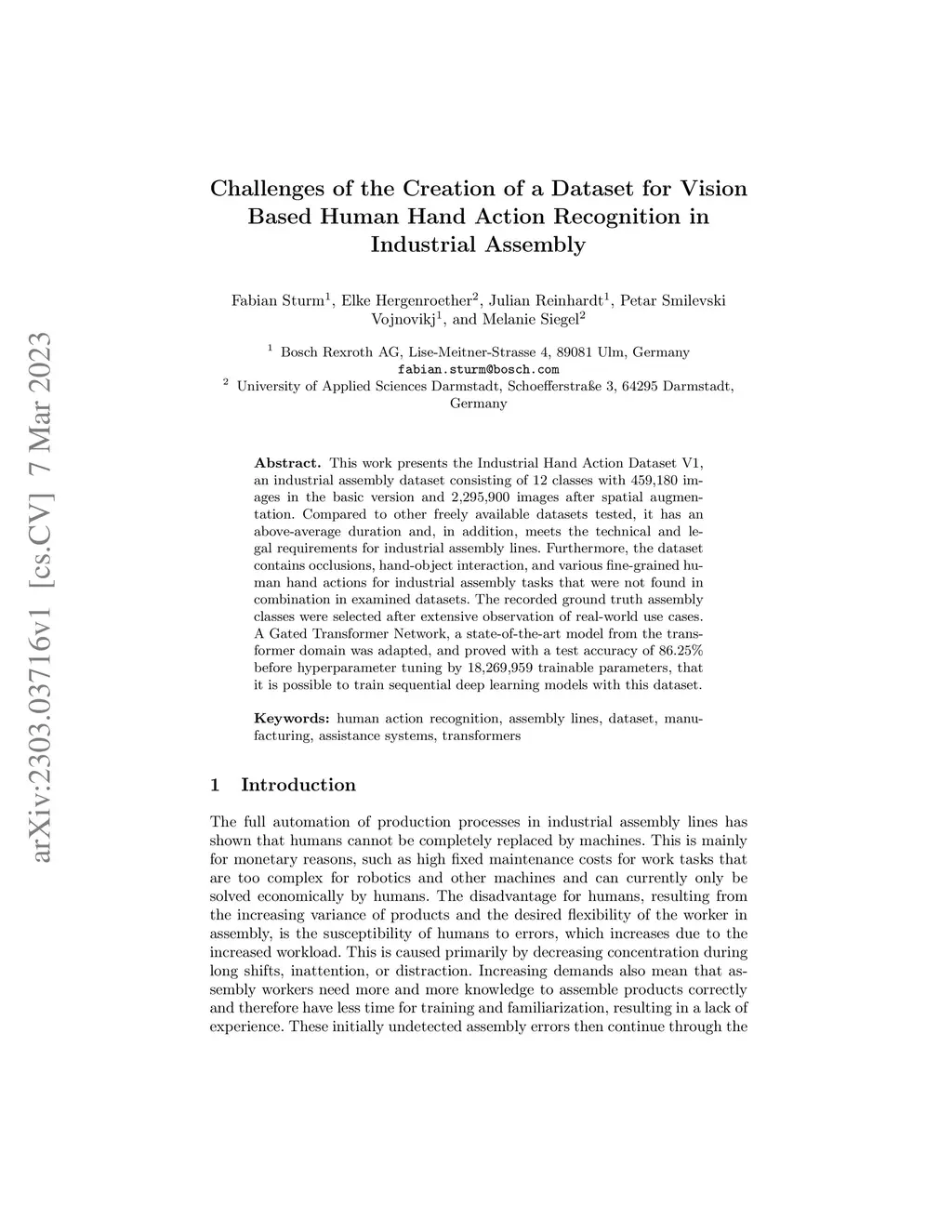 This work presents the Industrial Hand Action Dataset V1, an industrial assembly dataset consisting of 12 classes with 459,180 images in the basic version and 2,295,900 images after spatial augmentation. Compared to other freely available datasets tested, it has an above-average duration and, in addition, meets the technical and legal requirements for industrial assembly lines. Furthermore, the dataset contains occlusions, hand-object interaction, and various fine-grained human hand actions for industrial assembly tasks that were not found in combination in examined datasets. The recorded ground truth assembly classes were selected after extensive observation of real-world use cases. A Gated Transformer Network, a state-of-the-art model from the transformer domain was adapted, and proved with a test accuracy of 86.25% before hyperparameter tuning by 18,269,959 trainable parameters, that it is possible to train sequential deep learning models with this dataset.