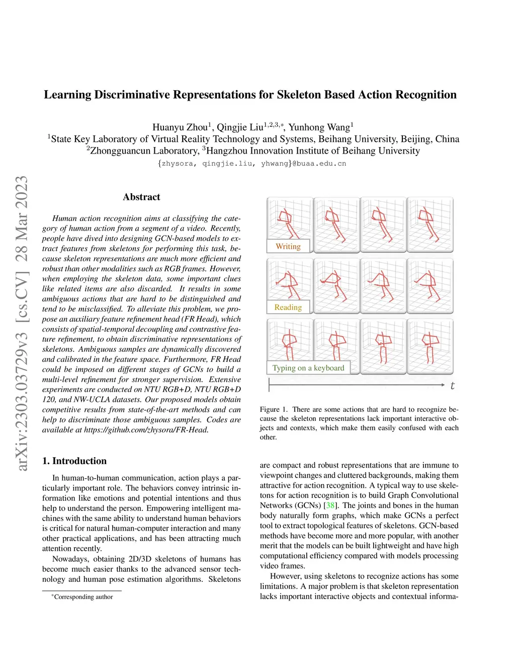 Human action recognition aims at classifying the category of human action from a segment of a video. Recently, people have dived into designing GCN-based models to extract features from skeletons for performing this task, because skeleton representations are much more efficient and robust than other modalities such as RGB frames. However, when employing the skeleton data, some important clues like related items are also discarded. It results in some ambiguous actions that are hard to be distinguished and tend to be misclassified. To alleviate this problem, we propose an auxiliary feature refinement head (FR Head), which consists of spatial-temporal decoupling and contrastive feature refinement, to obtain discriminative representations of skeletons. Ambiguous samples are dynamically discovered and calibrated in the feature space. Furthermore, FR Head could be imposed on different stages of GCNs to build a multi-level refinement for stronger supervision. Extensive experiments are conducted on NTU RGB+D, NTU RGB+D 120, and NW-UCLA datasets. Our proposed models obtain competitive results from state-of-the-art methods and can help to discriminate those ambiguous samples. Codes are available at https://github.com/zhysora/FR-Head.
