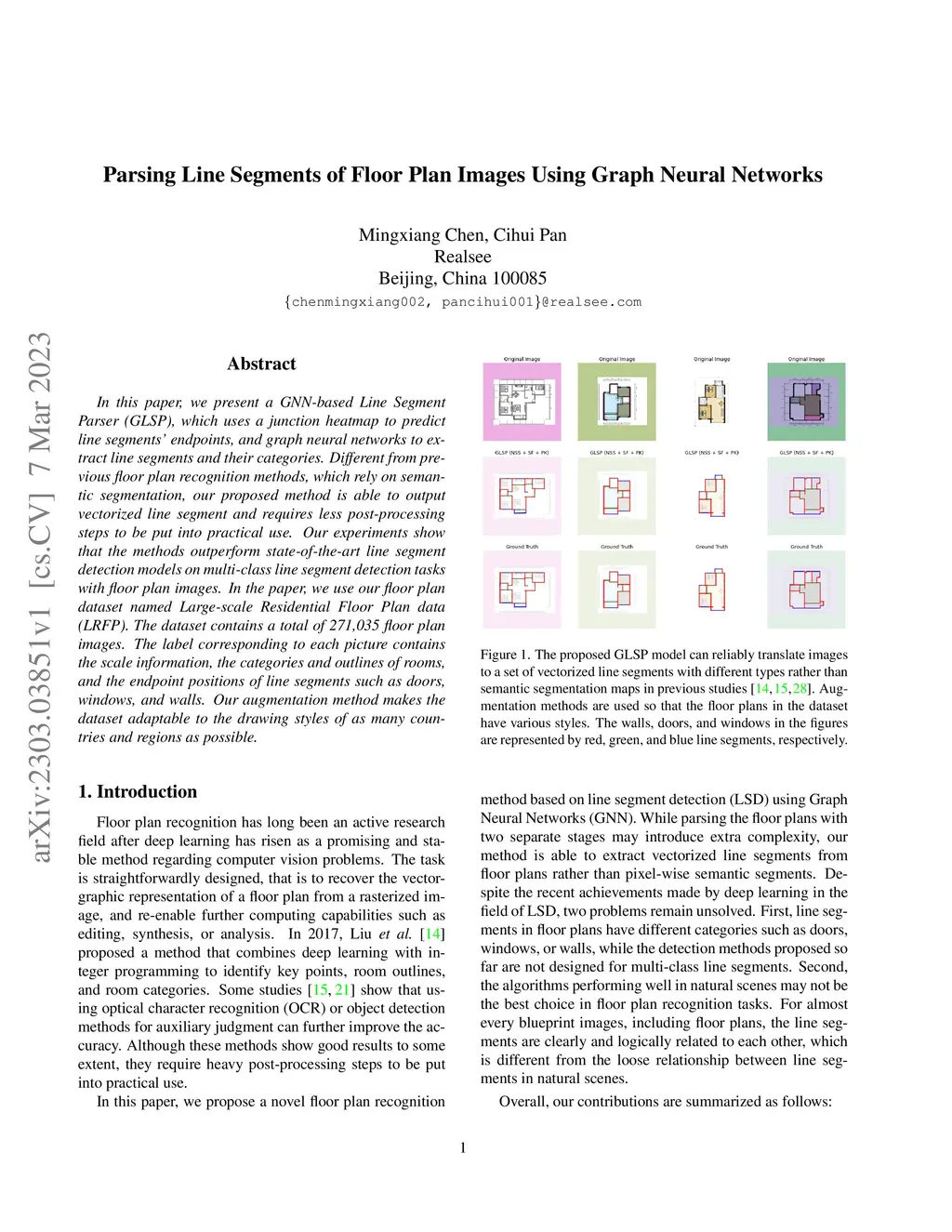 In this paper, we present a GNN-based Line Segment Parser (GLSP), which uses a junction heatmap to predict line segments' endpoints, and graph neural networks to extract line segments and their categories. Different from previous floor plan recognition methods, which rely on semantic segmentation, our proposed method is able to output vectorized line segment and requires less post-processing steps to be put into practical use. Our experiments show that the methods outperform state-of-the-art line segment detection models on multi-class line segment detection tasks with floor plan images. In the paper, we use our floor plan dataset named Large-scale Residential Floor Plan data (LRFP). The dataset contains a total of 271,035 floor plan images. The label corresponding to each picture contains the scale information, the categories and outlines of rooms, and the endpoint positions of line segments such as doors, windows, and walls. Our augmentation method makes the dataset adaptable to the drawing styles of as many countries and regions as possible.