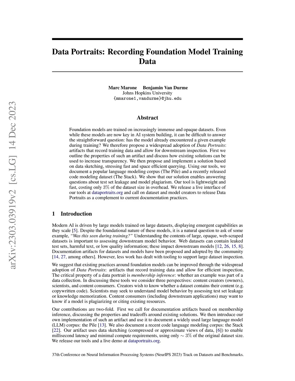 Foundation models are trained on increasingly immense and opaque datasets. Even while these models are now key in AI system building, it can be difficult to answer the straightforward question: has the model already encountered a given example during training? We therefore propose a widespread adoption of Data Portraits: artifacts that record training data and allow for downstream inspection. First we outline the properties of such an artifact and discuss how existing solutions can be used to increase transparency. We then propose and implement a solution based on data sketching, stressing fast and space efficient querying. Using our tools, we document a popular language modeling corpus (The Pile) and a recently released code modeling dataset (The Stack). We show that our solution enables answering questions about test set leakage and model plagiarism. Our tool is lightweight and fast, costing only 3% of the dataset size in overhead. We release a live interface of our tools at https://dataportraits.org/ and call on dataset and model creators to release Data Portraits as a complement to current documentation practices.