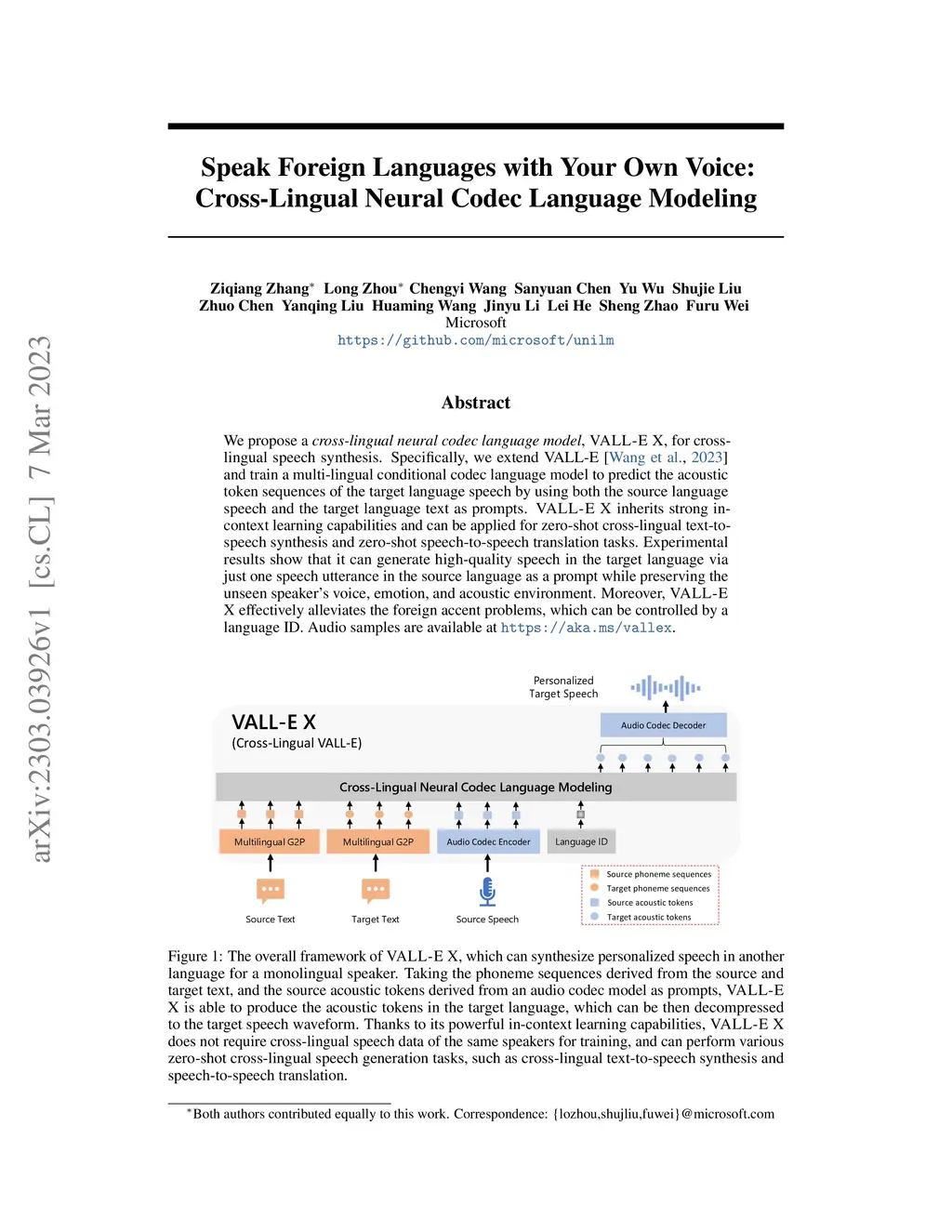 We propose a cross-lingual neural codec language model, VALL-E X, for cross-lingual speech synthesis. Specifically, we extend VALL-E and train a multi-lingual conditional codec language model to predict the acoustic token sequences of the target language speech by using both the source language speech and the target language text as prompts. VALL-E X inherits strong in-context learning capabilities and can be applied for zero-shot cross-lingual text-to-speech synthesis and zero-shot speech-to-speech translation tasks. Experimental results show that it can generate high-quality speech in the target language via just one speech utterance in the source language as a prompt while preserving the unseen speaker's voice, emotion, and acoustic environment. Moreover, VALL-E X effectively alleviates the foreign accent problems, which can be controlled by a language ID. Audio samples are available at \url{https://aka.ms/vallex}.