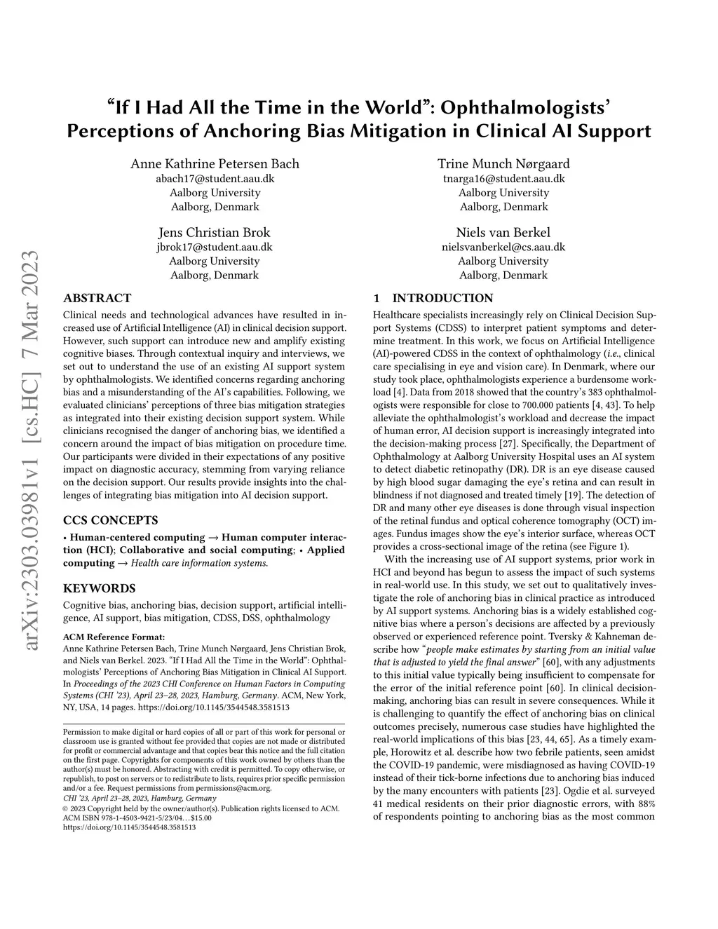Clinical needs and technological advances have resulted in increased use of Artificial Intelligence (AI) in clinical decision support. However, such support can introduce new and amplify existing cognitive biases. Through contextual inquiry and interviews, we set out to understand the use of an existing AI support system by ophthalmologists. We identified concerns regarding anchoring bias and a misunderstanding of the AI's capabilities. Following, we evaluated clinicians' perceptions of three bias mitigation strategies as integrated into their existing decision support system. While clinicians recognised the danger of anchoring bias, we identified a concern around the impact of bias mitigation on procedure time. Our participants were divided in their expectations of any positive impact on diagnostic accuracy, stemming from varying reliance on the decision support. Our results provide insights into the challenges of integrating bias mitigation into AI decision support.