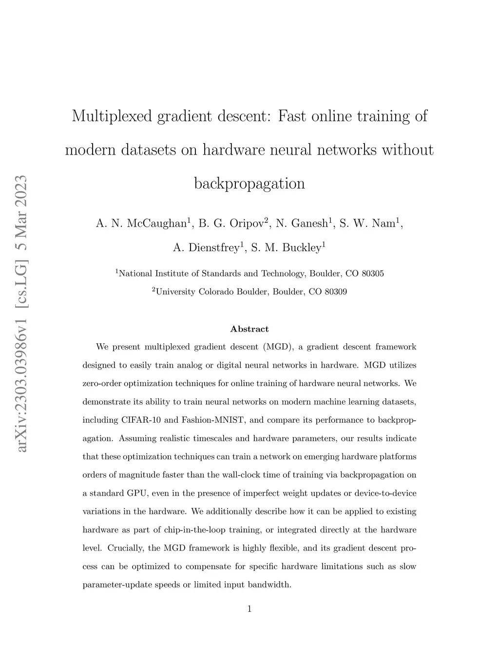 We present multiplexed gradient descent (MGD), a gradient descent framework designed to easily train analog or digital neural networks in hardware. MGD utilizes zero-order optimization techniques for online training of hardware neural networks. We demonstrate its ability to train neural networks on modern machine learning datasets, including CIFAR-10 and Fashion-MNIST, and compare its performance to backpropagation. Assuming realistic timescales and hardware parameters, our results indicate that these optimization techniques can train a network on emerging hardware platforms orders of magnitude faster than the wall-clock time of training via backpropagation on a standard GPU, even in the presence of imperfect weight updates or device-to-device variations in the hardware. We additionally describe how it can be applied to existing hardware as part of chip-in-the-loop training, or integrated directly at the hardware level. Crucially, the MGD framework is highly flexible, and its gradient descent process can be optimized to compensate for specific hardware limitations such as slow parameter-update speeds or limited input bandwidth.