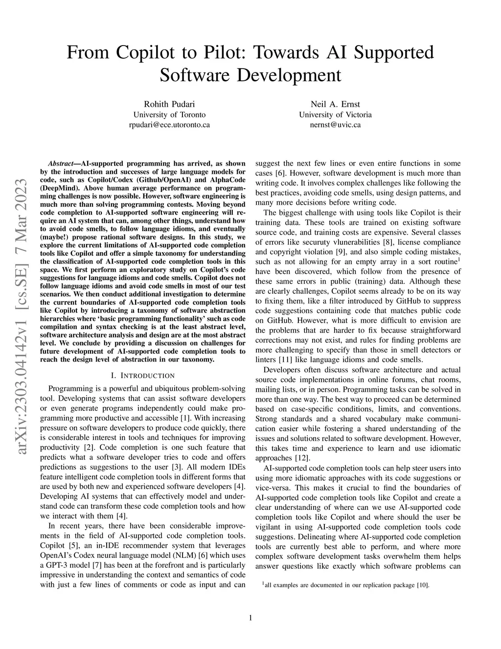 AI-supported programming has arrived, as shown by the introduction and successes of large language models for code, such as Copilot/Codex (Github/OpenAI) and AlphaCode (DeepMind). Above human average performance on programming challenges is now possible. However, software engineering is much more than solving programming contests. Moving beyond code completion to AI-supported software engineering will require an AI system that can, among other things, understand how to avoid code smells, to follow language idioms, and eventually (maybe!) propose rational software designs. In this study, we explore the current limitations of AI-supported code completion tools like Copilot and offer a simple taxonomy for understanding the classification of AI-supported code completion tools in this space. We first perform an exploratory study on Copilot's code suggestions for language idioms and code smells. Copilot does not follow language idioms and avoid code smells in most of our test scenarios. We then conduct additional investigation to determine the current boundaries of AI-supported code completion tools like Copilot by introducing a taxonomy of software abstraction hierarchies where 'basic programming functionality' such as code compilation and syntax checking is at the least abstract level, software architecture analysis and design are at the most abstract level. We conclude by providing a discussion on challenges for future development of AI-supported code completion tools to reach the design level of abstraction in our taxonomy.
