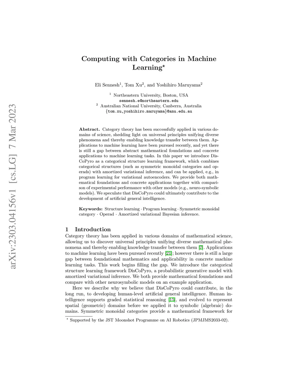 Category theory has been successfully applied in various domains of science, shedding light on universal principles unifying diverse phenomena and thereby enabling knowledge transfer between them. Applications to machine learning have been pursued recently, and yet there is still a gap between abstract mathematical foundations and concrete applications to machine learning tasks. In this paper we introduce DisCoPyro as a categorical structure learning framework, which combines categorical structures (such as symmetric monoidal categories and operads) with amortized variational inference, and can be applied, e.g., in program learning for variational autoencoders. We provide both mathematical foundations and concrete applications together with comparison of experimental performance with other models (e.g., neuro-symbolic models). We speculate that DisCoPyro could ultimately contribute to the development of artificial general intelligence.