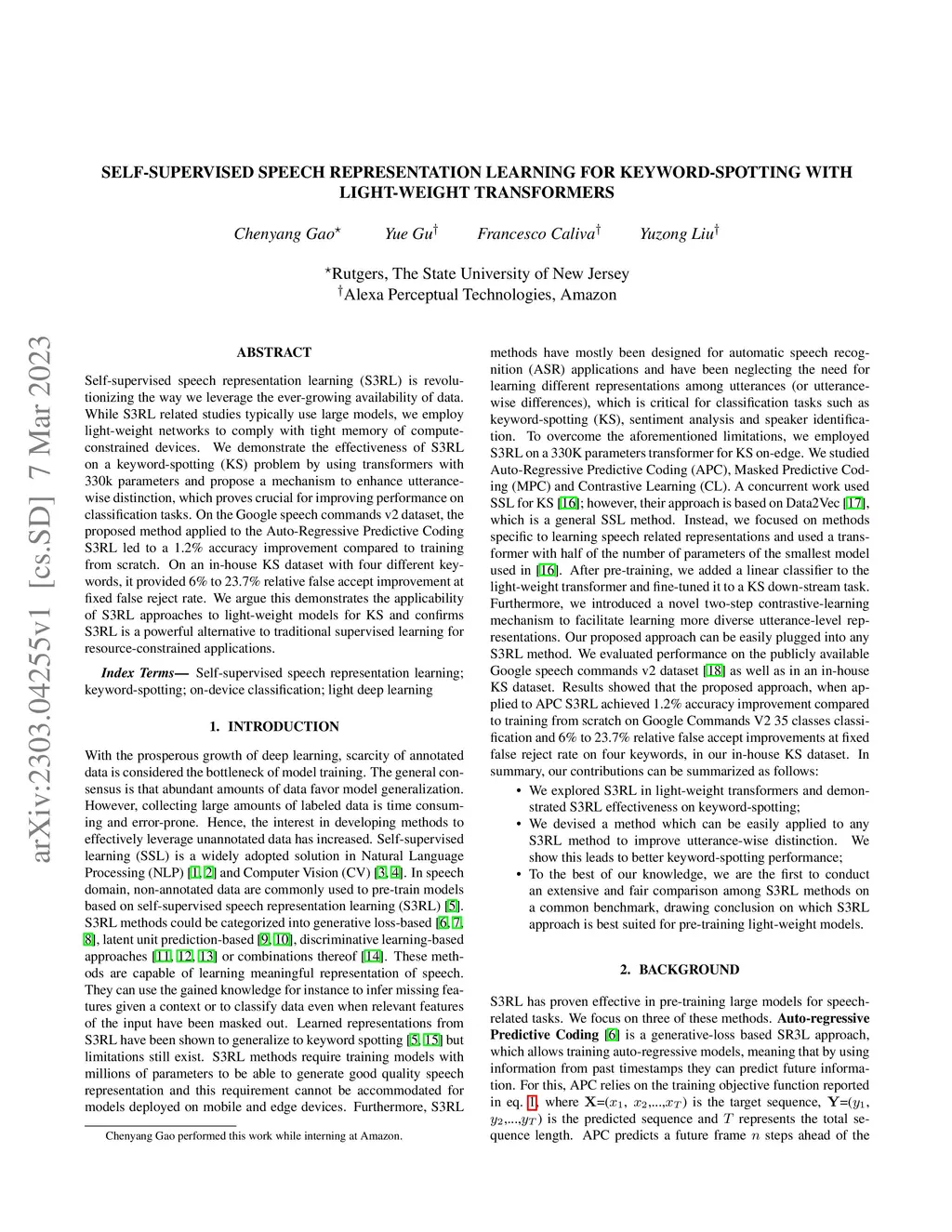 Self-supervised speech representation learning (S3RL) is revolutionizing the way we leverage the ever-growing availability of data. While S3RL related studies typically use large models, we employ light-weight networks to comply with tight memory of compute-constrained devices. We demonstrate the effectiveness of S3RL on a keyword-spotting (KS) problem by using transformers with 330k parameters and propose a mechanism to enhance utterance-wise distinction, which proves crucial for improving performance on classification tasks. On the Google speech commands v2 dataset, the proposed method applied to the Auto-Regressive Predictive Coding S3RL led to a 1.2% accuracy improvement compared to training from scratch. On an in-house KS dataset with four different keywords, it provided 6% to 23.7% relative false accept improvement at fixed false reject rate. We argue this demonstrates the applicability of S3RL approaches to light-weight models for KS and confirms S3RL is a powerful alternative to traditional supervised learning for resource-constrained applications.