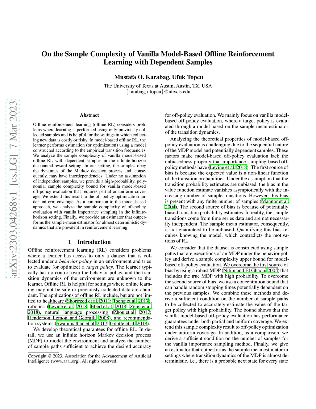 Offline reinforcement learning (offline RL) considers problems where learning is performed using only previously collected samples and is helpful for the settings in which collecting new data is costly or risky. In model-based offline RL, the learner performs estimation (or optimization) using a model constructed according to the empirical transition frequencies. We analyze the sample complexity of vanilla model-based offline RL with dependent samples in the infinite-horizon discounted-reward setting. In our setting, the samples obey the dynamics of the Markov decision process and, consequently, may have interdependencies. Under no assumption of independent samples, we provide a high-probability, polynomial sample complexity bound for vanilla model-based off-policy evaluation that requires partial or uniform coverage. We extend this result to the off-policy optimization under uniform coverage. As a comparison to the model-based approach, we analyze the sample complexity of off-policy evaluation with vanilla importance sampling in the infinite-horizon setting. Finally, we provide an estimator that outperforms the sample-mean estimator for almost deterministic dynamics that are prevalent in reinforcement learning.