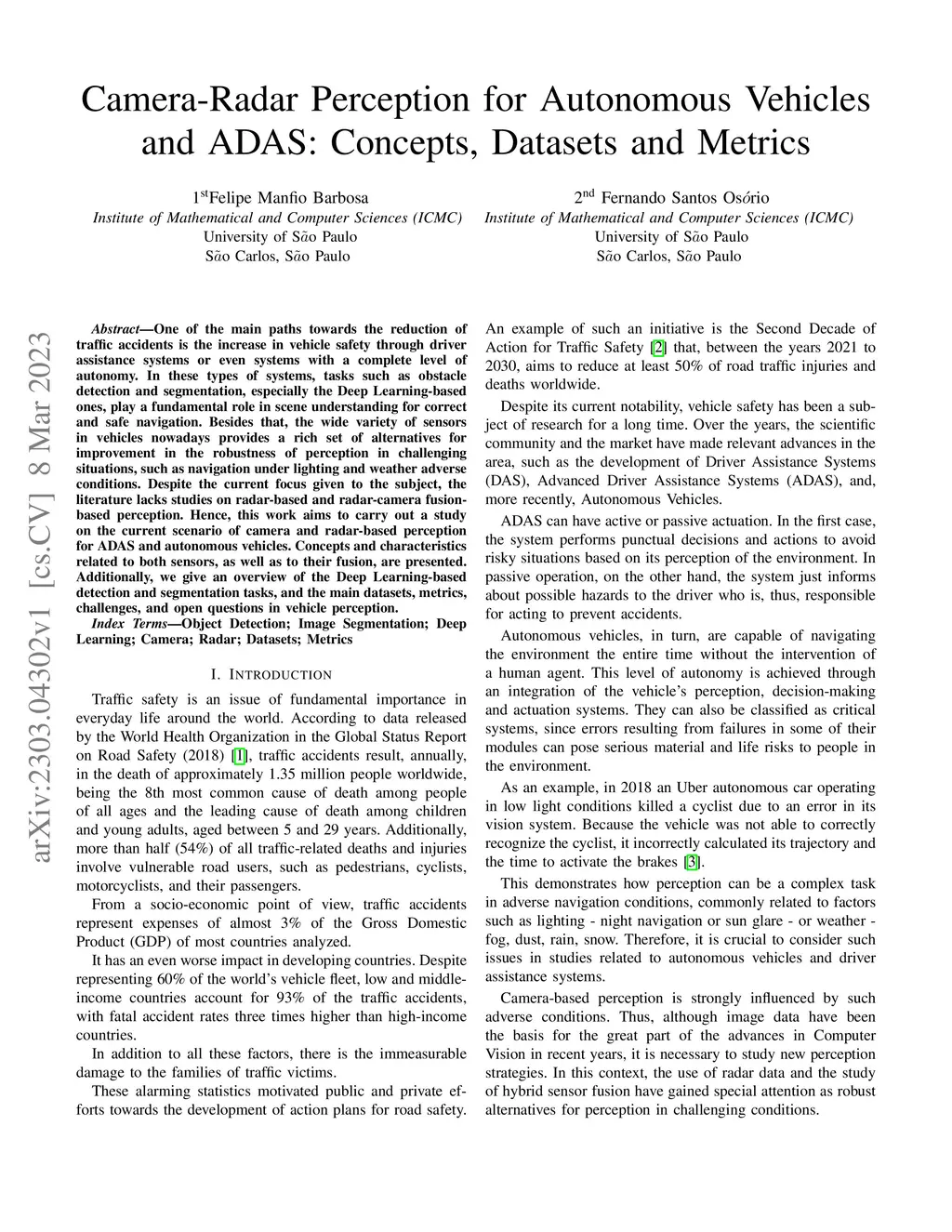 One of the main paths towards the reduction of traffic accidents is the increase in vehicle safety through driver assistance systems or even systems with a complete level of autonomy. In these types of systems, tasks such as obstacle detection and segmentation, especially the Deep Learning-based ones, play a fundamental role in scene understanding for correct and safe navigation. Besides that, the wide variety of sensors in vehicles nowadays provides a rich set of alternatives for improvement in the robustness of perception in challenging situations, such as navigation under lighting and weather adverse conditions. Despite the current focus given to the subject, the literature lacks studies on radar-based and radar-camera fusion-based perception. Hence, this work aims to carry out a study on the current scenario of camera and radar-based perception for ADAS and autonomous vehicles. Concepts and characteristics related to both sensors, as well as to their fusion, are presented. Additionally, we give an overview of the Deep Learning-based detection and segmentation tasks, and the main datasets, metrics, challenges, and open questions in vehicle perception.