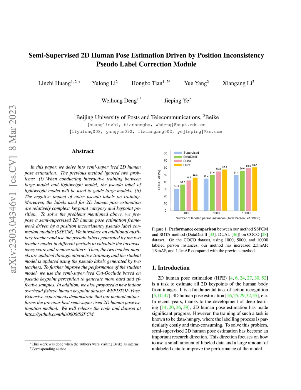 In this paper, we delve into semi-supervised 2D human pose estimation. The previous method ignored two problems: (i) When conducting interactive training between large model and lightweight model, the pseudo label of lightweight model will be used to guide large models. (ii) The negative impact of noise pseudo labels on training. Moreover, the labels used for 2D human pose estimation are relatively complex: keypoint category and keypoint position. To solve the problems mentioned above, we propose a semi-supervised 2D human pose estimation framework driven by a position inconsistency pseudo label correction module (SSPCM). We introduce an additional auxiliary teacher and use the pseudo labels generated by the two teacher model in different periods to calculate the inconsistency score and remove outliers. Then, the two teacher models are updated through interactive training, and the student model is updated using the pseudo labels generated by two teachers. To further improve the performance of the student model, we use the semi-supervised Cut-Occlude based on pseudo keypoint perception to generate more hard and effective samples. In addition, we also proposed a new indoor overhead fisheye human keypoint dataset WEPDTOF-Pose. Extensive experiments demonstrate that our method outperforms the previous best semi-supervised 2D human pose estimation method. We will release the code and dataset at https://github.com/hlz0606/SSPCM.