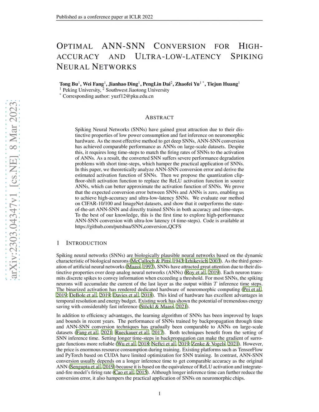 Spiking Neural Networks (SNNs) have gained great attraction due to their distinctive properties of low power consumption and fast inference on neuromorphic hardware. As the most effective method to get deep SNNs, ANN-SNN conversion has achieved comparable performance as ANNs on large-scale datasets. Despite this, it requires long time-steps to match the firing rates of SNNs to the activation of ANNs. As a result, the converted SNN suffers severe performance degradation problems with short time-steps, which hamper the practical application of SNNs. In this paper, we theoretically analyze ANN-SNN conversion error and derive the estimated activation function of SNNs. Then we propose the quantization clip-floor-shift activation function to replace the ReLU activation function in source ANNs, which can better approximate the activation function of SNNs. We prove that the expected conversion error between SNNs and ANNs is zero, enabling us to achieve high-accuracy and ultra-low-latency SNNs. We evaluate our method on CIFAR-10/100 and ImageNet datasets, and show that it outperforms the state-of-the-art ANN-SNN and directly trained SNNs in both accuracy and time-steps. To the best of our knowledge, this is the first time to explore high-performance ANN-SNN conversion with ultra-low latency (4 time-steps). Code is available at https://github.com/putshua/SNN\_conversion\_QCFS
