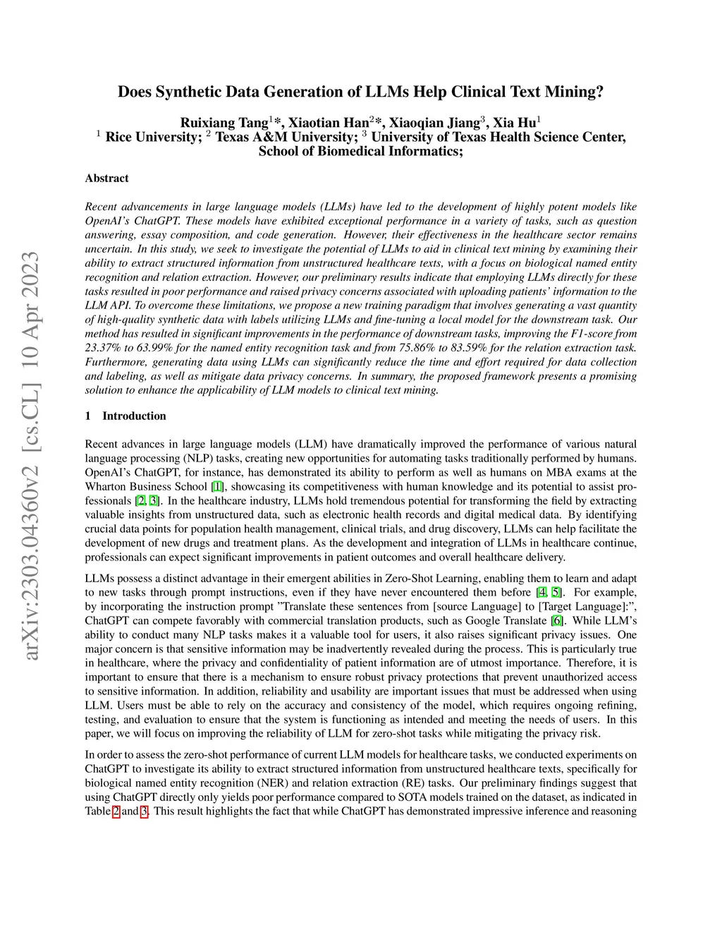 Recent advancements in large language models (LLMs) have led to the development of highly potent models like OpenAI's ChatGPT. These models have exhibited exceptional performance in a variety of tasks, such as question answering, essay composition, and code generation. However, their effectiveness in the healthcare sector remains uncertain. In this study, we seek to investigate the potential of ChatGPT to aid in clinical text mining by examining its ability to extract structured information from unstructured healthcare texts, with a focus on biological named entity recognition and relation extraction. However, our preliminary results indicate that employing ChatGPT directly for these tasks resulted in poor performance and raised privacy concerns associated with uploading patients' information to the ChatGPT API. To overcome these limitations, we propose a new training paradigm that involves generating a vast quantity of high-quality synthetic data with labels utilizing ChatGPT and fine-tuning a local model for the downstream task. Our method has resulted in significant improvements in the performance of downstream tasks, improving the F1-score from 23.37% to 63.99% for the named entity recognition task and from 75.86% to 83.59% for the relation extraction task. Furthermore, generating data using ChatGPT can significantly reduce the time and effort required for data collection and labeling, as well as mitigate data privacy concerns. In summary, the proposed framework presents a promising solution to enhance the applicability of LLM models to clinical text mining.