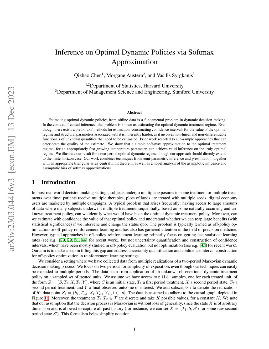 Estimating optimal dynamic policies from offline data is a fundamental problem in dynamic decision making. In the context of causal inference, the problem is known as estimating the optimal dynamic treatment regime. Even though there exists a plethora of methods for estimation, constructing confidence intervals for the value of the optimal regime and structural parameters associated with it is inherently harder, as it involves non-linear and non-differentiable functionals of unknown quantities that need to be estimated. Prior work resorted to sub-sample approaches that can deteriorate the quality of the estimate. We show that a simple soft-max approximation to the optimal treatment regime, for an appropriately fast growing temperature parameter, can achieve valid inference on the truly optimal regime. We illustrate our result for a two-period optimal dynamic regime, though our approach should directly extend to the finite horizon case. Our work combines techniques from semi-parametric inference and -estimation, together with an appropriate triangular array central limit theorem, as well as a novel analysis of the asymptotic influence and asymptotic bias of softmax approximations.
