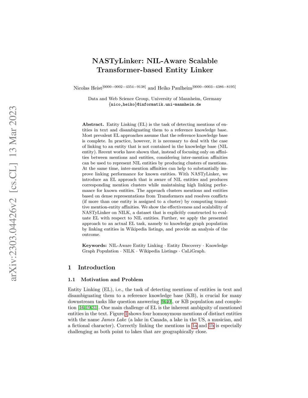 Entity Linking (EL) is the task of detecting mentions of entities in text and disambiguating them to a reference knowledge base. Most prevalent EL approaches assume that the reference knowledge base is complete. In practice, however, it is necessary to deal with the case of linking to an entity that is not contained in the knowledge base (NIL entity). Recent works have shown that, instead of focusing only on affinities between mentions and entities, considering inter-mention affinities can be used to represent NIL entities by producing clusters of mentions. At the same time, inter-mention affinities can help to substantially improve linking performance for known entities. With NASTyLinker, we introduce an EL approach that is aware of NIL entities and produces corresponding mention clusters while maintaining high linking performance for known entities. The approach clusters mentions and entities based on dense representations from Transformers and resolves conflicts (if more than one entity is assigned to a cluster) by computing transitive mention-entity affinities. We show the effectiveness and scalability of NASTyLinker on NILK, a dataset that is explicitly constructed to evaluate EL with respect to NIL entities. Further, we apply the presented approach to an actual EL task, namely to knowledge graph population by linking entities in Wikipedia listings, and provide an analysis of the outcome.