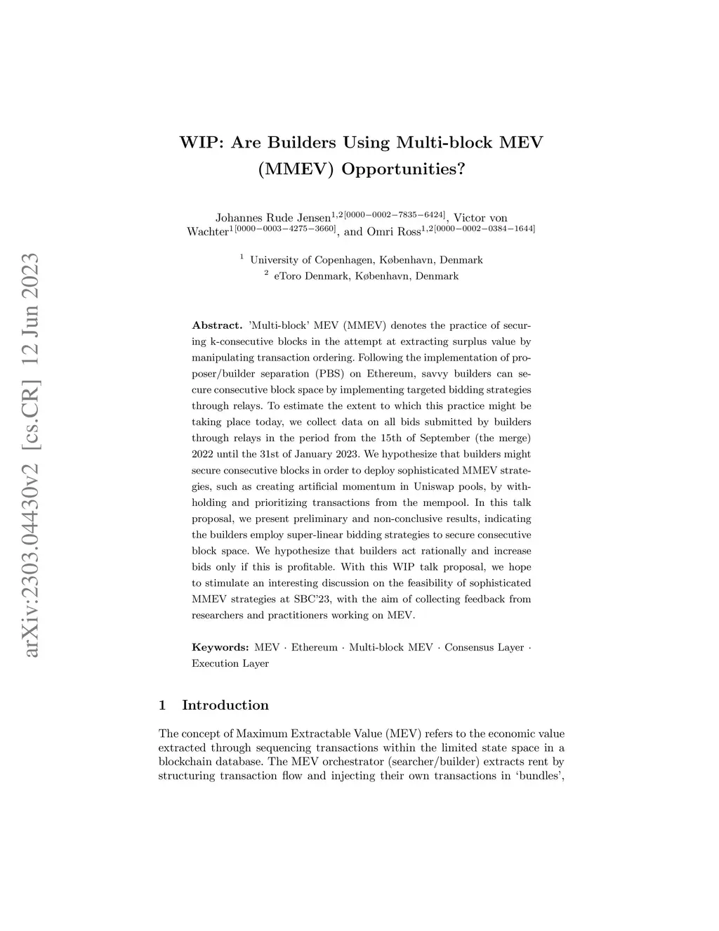 Multi-block MEV (MMEV) denotes the practice of securing k-consecutive blocks in an attempt at extracting surplus value by manipulating transaction ordering. Following the implementation of pro-poser/builder separation (PBS) on Ethereum, savvy builders can secure consecutive block space by implementing targeted bidding strategies through relays. To estimate the extent to which this practice might be taking place today, we collect data on all bids submitted by builders through relays in the period from the 15th of September (the merge) 2022 until the 31st of January 2023. We hypothesize that builders might secure consecutive blocks in order to deploy sophisticated MMEV strategies, such as creating artificial momentum in Uniswap pools, by withholding and prioritizing transactions from the mempool. In this talk proposal, we present preliminary and non-conclusive results, indicating the builders employ super-linear bidding strategies to secure consecutive block space. We hypothesize that builders act rationally and increase bids only if this is profitable. With this WIP talk proposal, we hope to stimulate an interesting discussion on the feasibility of sophisticated MMEV strategies at SBC23, with the aim of collecting feedback from researchers and practitioners working on MEV.