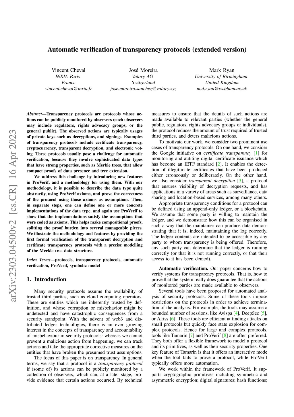Transparency protocols are protocols whose actions can be publicly monitored by observers (such observers may include regulators, rights advocacy groups, or the general public). The observed actions are typically usages of private keys such as decryptions, and signings. Examples of transparency protocols include certificate transparency, cryptocurrency, transparent decryption, and electronic voting. These protocols usually pose a challenge for automatic verification, because they involve sophisticated data types that have strong properties, such as Merkle trees, that allow compact proofs of data presence and tree extension. We address this challenge by introducing new features in ProVerif, and a methodology for using them. With our methodology, it is possible to describe the data type quite abstractly, using ProVerif axioms, and prove the correctness of the protocol using those axioms as assumptions. Then, in separate steps, one can define one or more concrete implementations of the data type, and again use ProVerif to show that the implementations satisfy the assumptions that were coded as axioms. This helps make compositional proofs, splitting the proof burden into several manageable pieces. We illustrate the methodology and features by providing the first formal verification of the transparent decryption and certificate transparency protocols with a precise modelling of the Merkle tree data structure.
