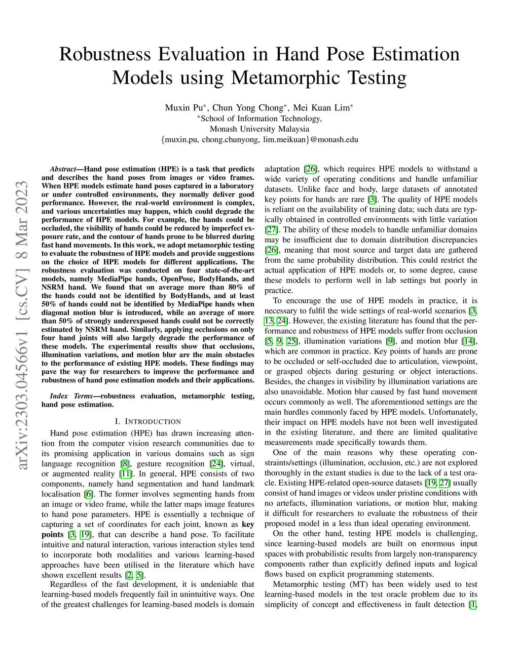 Robustness Evaluation in Hand Pose Estimation Models using Metamorphic