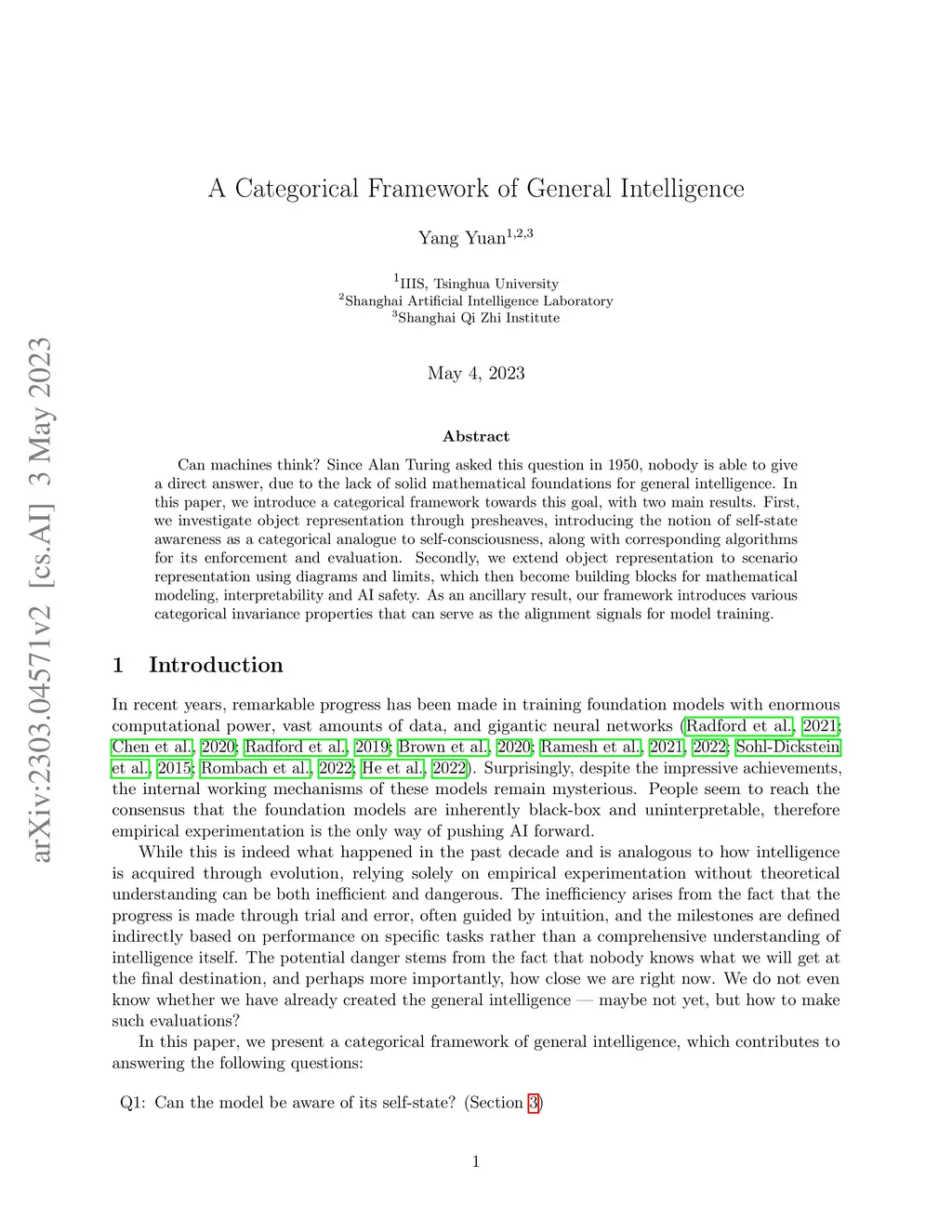 Can machines think? Since Alan Turing asked this question in 1950, nobody is able to give a direct answer, due to the lack of solid mathematical foundations for general intelligence. In this paper, we introduce a categorical framework towards this goal, with two main results. First, we investigate object representation through presheaves, introducing the notion of self-state awareness as a categorical analogue to self-consciousness, along with corresponding algorithms for its enforcement and evaluation. Secondly, we extend object representation to scenario representation using diagrams and limits, which then become building blocks for mathematical modeling, interpretability and AI safety. As an ancillary result, our framework introduces various categorical invariance properties that can serve as the alignment signals for model training.