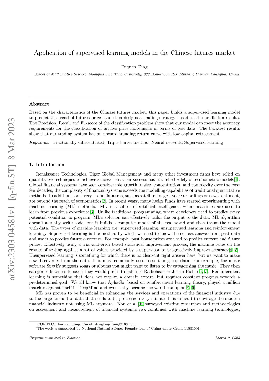 Application of supervised learning models in the Chinese futures market