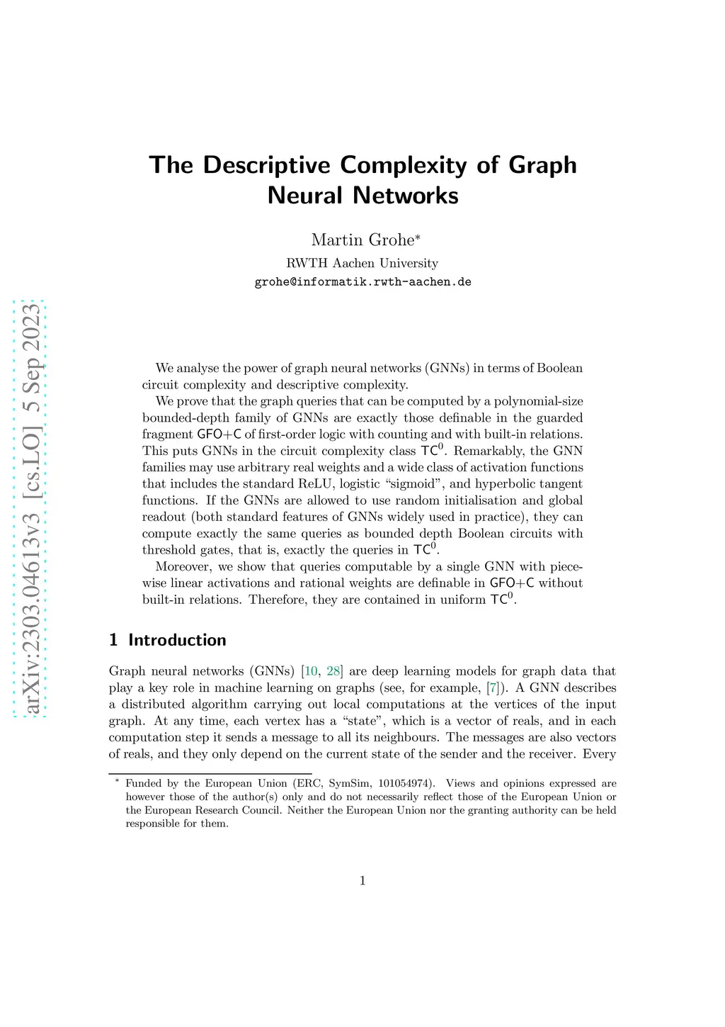 We analyse the power of graph neural networks (GNNs) in terms of Boolean circuit complexity and descriptive complexity. We prove that the graph queries that can be computed by a polynomial-size bounded-depth family of GNNs are exactly those definable in the guarded fragment GFO+C of first-order logic with counting and with built-in relations. This puts GNNs in the circuit complexity class TC^0. Remarkably, the GNN families may use arbitrary real weights and a wide class of activation functions that includes the standard ReLU, logistic "sigmod", and hyperbolic tangent functions. If the GNNs are allowed to use random initialisation and global readout (both standard features of GNNs widely used in practice), they can compute exactly the same queries as bounded depth Boolean circuits with threshold gates, that is, exactly the queries in TC^0. Moreover, we show that queries computable by a single GNN with piecewise linear activations and rational weights are definable in GFO+C without built-in relations. Therefore, they are contained in uniform TC^0.