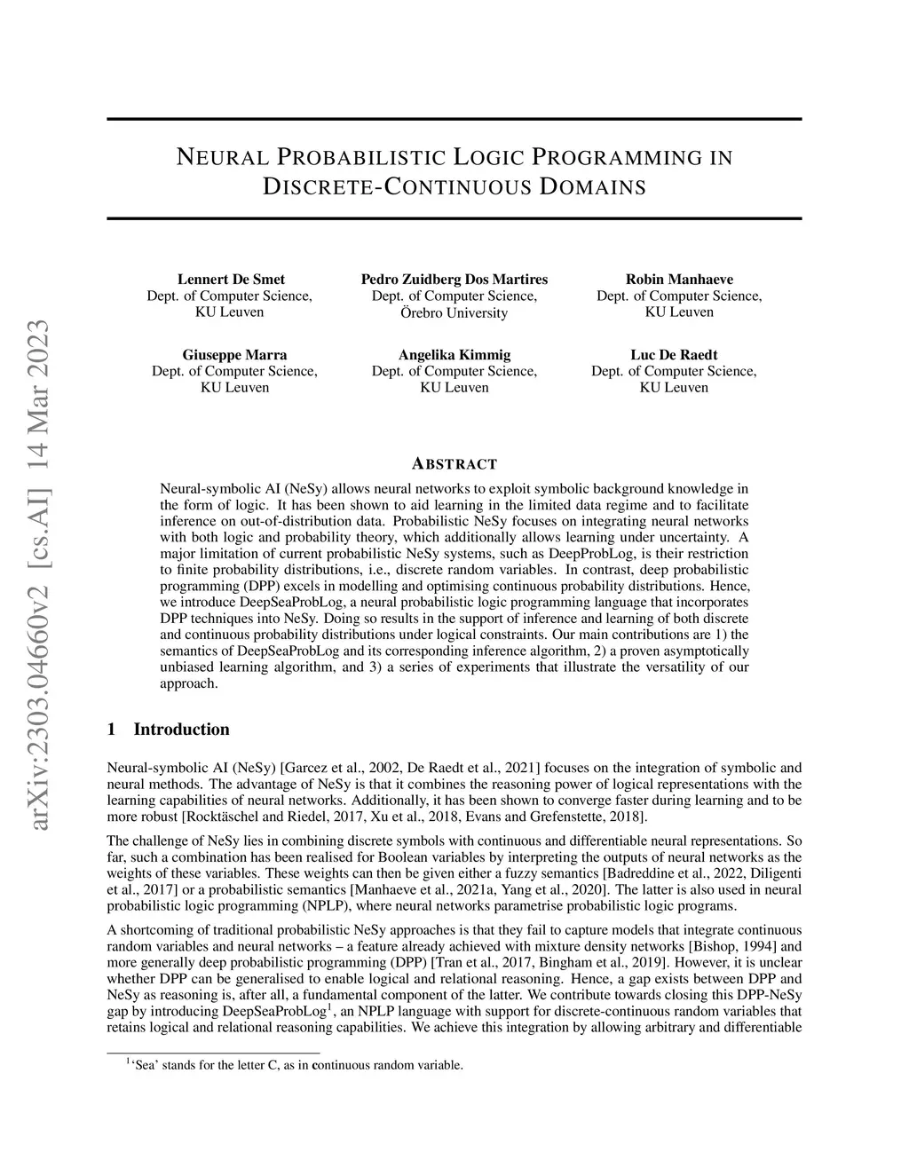 Neural-symbolic AI (NeSy) allows neural networks to exploit symbolic background knowledge in the form of logic. It has been shown to aid learning in the limited data regime and to facilitate inference on out-of-distribution data. Probabilistic NeSy focuses on integrating neural networks with both logic and probability theory, which additionally allows learning under uncertainty. A major limitation of current probabilistic NeSy systems, such as DeepProbLog, is their restriction to finite probability distributions, i.e., discrete random variables. In contrast, deep probabilistic programming (DPP) excels in modelling and optimising continuous probability distributions. Hence, we introduce DeepSeaProbLog, a neural probabilistic logic programming language that incorporates DPP techniques into NeSy. Doing so results in the support of inference and learning of both discrete and continuous probability distributions under logical constraints. Our main contributions are 1) the semantics of DeepSeaProbLog and its corresponding inference algorithm, 2) a proven asymptotically unbiased learning algorithm, and 3) a series of experiments that illustrate the versatility of our approach.