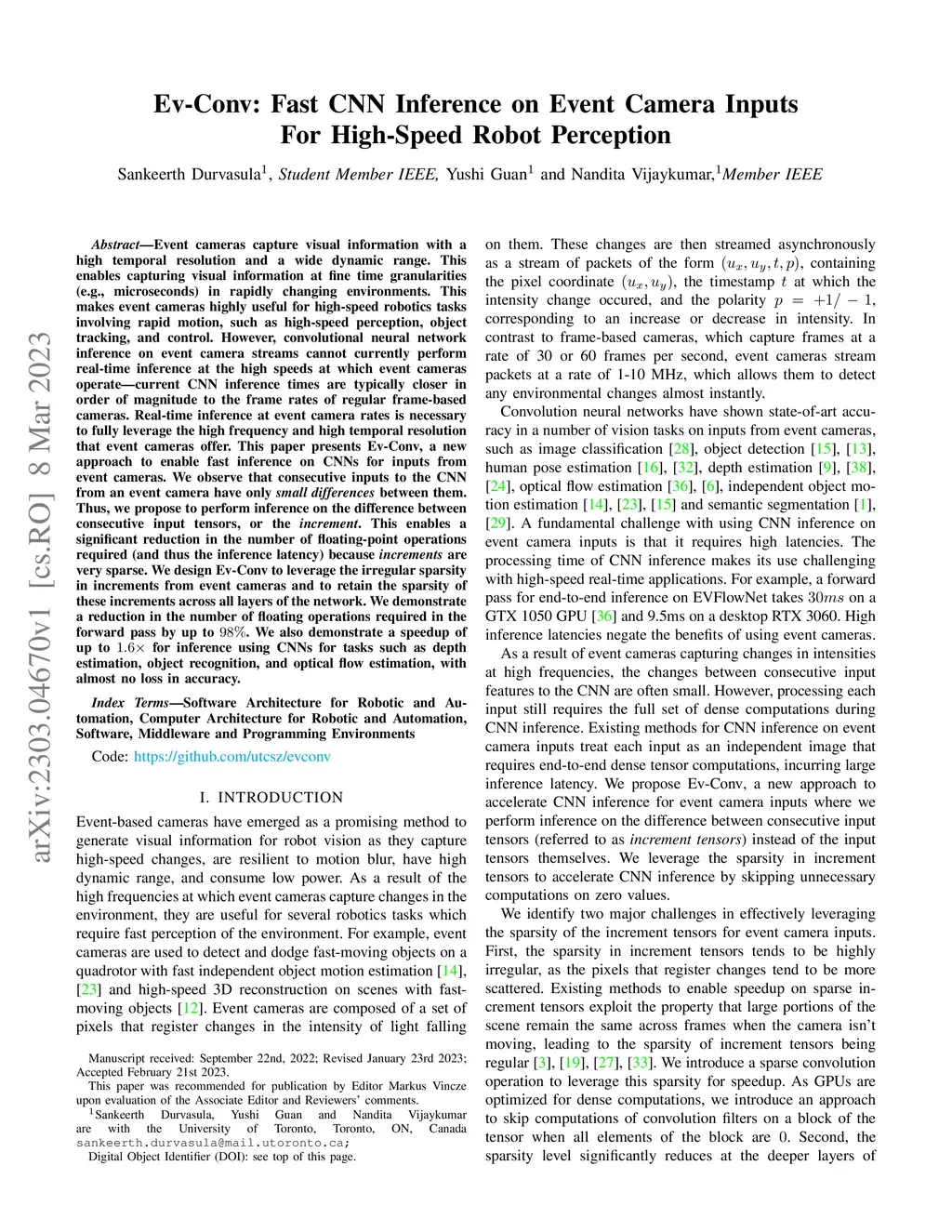 EvConv: Fast CNN Inference on Event Camera Inputs For High-Speed Robot