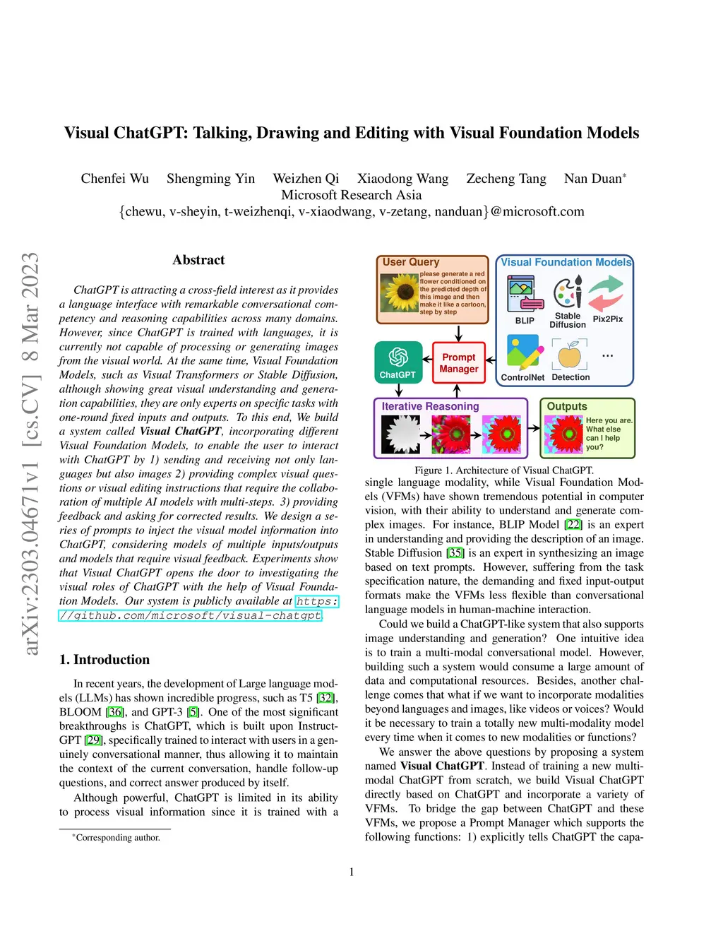 ChatGPT is attracting a cross-field interest as it provides a language interface with remarkable conversational competency and reasoning capabilities across many domains. However, since ChatGPT is trained with languages, it is currently not capable of processing or generating images from the visual world. At the same time, Visual Foundation Models, such as Visual Transformers or Stable Diffusion, although showing great visual understanding and generation capabilities, they are only experts on specific tasks with one-round fixed inputs and outputs. To this end, We build a system called \textbf{Visual ChatGPT}, incorporating different Visual Foundation Models, to enable the user to interact with ChatGPT by 1) sending and receiving not only languages but also images 2) providing complex visual questions or visual editing instructions that require the collaboration of multiple AI models with multi-steps. 3) providing feedback and asking for corrected results. We design a series of prompts to inject the visual model information into ChatGPT, considering models of multiple inputs/outputs and models that require visual feedback. Experiments show that Visual ChatGPT opens the door to investigating the visual roles of ChatGPT with the help of Visual Foundation Models. Our system is publicly available at \url{https://github.com/microsoft/visual-chatgpt}.