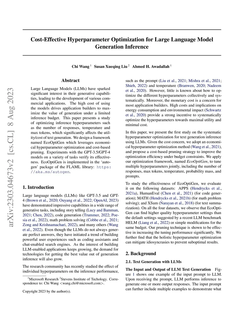 Large Language Models (LLMs) have sparked significant interest in their generative capabilities, leading to the development of various commercial applications. The high cost of using the models drives application builders to maximize the value of generation under a limited inference budget. This paper presents a study of optimizing inference hyperparameters such as the number of responses, temperature and max tokens, which significantly affects the utility/cost of text generation. We design a framework named EcoOptiGen which leverages economical hyperparameter optimization and cost-based pruning. Experiments with the GPT-3.5/GPT-4 models on a variety of tasks verify its effectiveness. EcoOptiGen is implemented in the `autogen' package of the FLAML library: \url{https://aka.ms/autogen}.