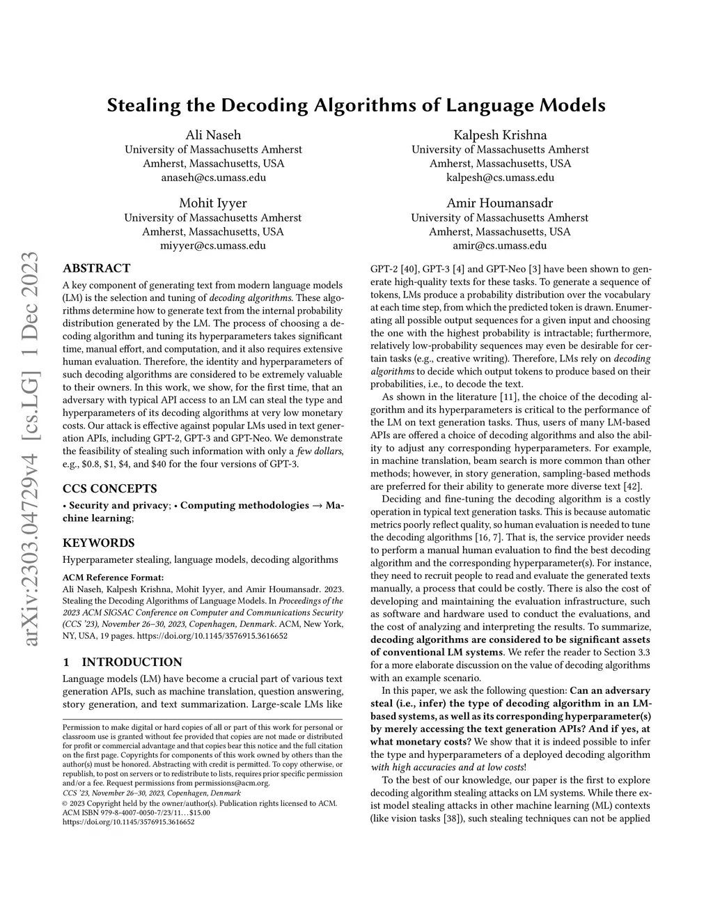A key component of generating text from modern language models (LM) is the selection and tuning of decoding algorithms. These algorithms determine how to generate text from the internal probability distribution generated by the LM. The process of choosing a decoding algorithm and tuning its hyperparameters takes significant time, manual effort, and computation, and it also requires extensive human evaluation. Therefore, the identity and hyperparameters of such decoding algorithms are considered to be extremely valuable to their owners. In this work, we show, for the first time, that an adversary with typical API access to an LM can steal the type and hyperparameters of its decoding algorithms at very low monetary costs. Our attack is effective against popular LMs used in text generation APIs, including GPT-2, GPT-3 and GPT-Neo. We demonstrate the feasibility of stealing such information with only a few dollars, e.g., \0.8$, \1$, \4$, and \40$ for the four versions of GPT-3.