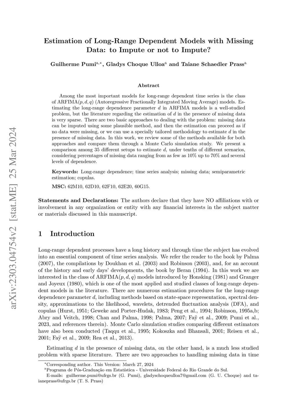 Among the most important models for long-range dependent time series is the class of ARFIMA (Autoregressive Fractionally Integrated Moving Average) models. Estimating the long-range dependence parameter in ARFIMA models is a well-studied problem, but the literature regarding the estimation of in the presence of missing data is very sparse. There are two basic approaches to dealing with the problem: missing data can be imputed using some plausible method, and then the estimation can proceed as if no data were missing, or we can use a specially tailored methodology to estimate in the presence of missing data. In this work, we review some of the methods available for both approaches and compare them through a Monte Carlo simulation study. We present a comparison among 35 different setups to estimate , under tenths of different scenarios, considering percentages of missing data ranging from as few as 10\% up to 70\% and several levels of dependence.