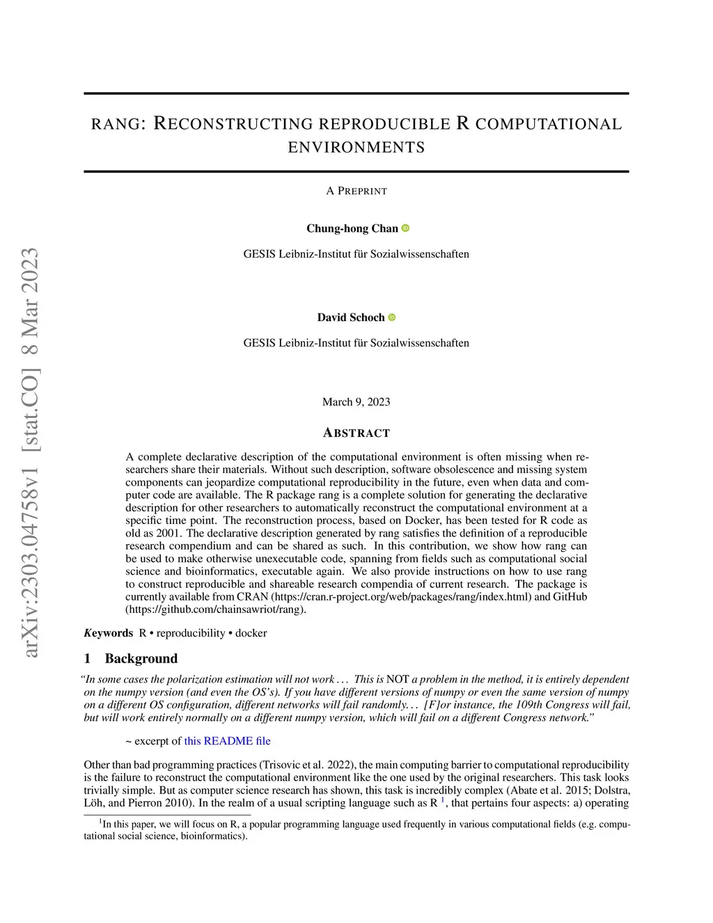 RANG: Reconstructing reproducible R computational environments