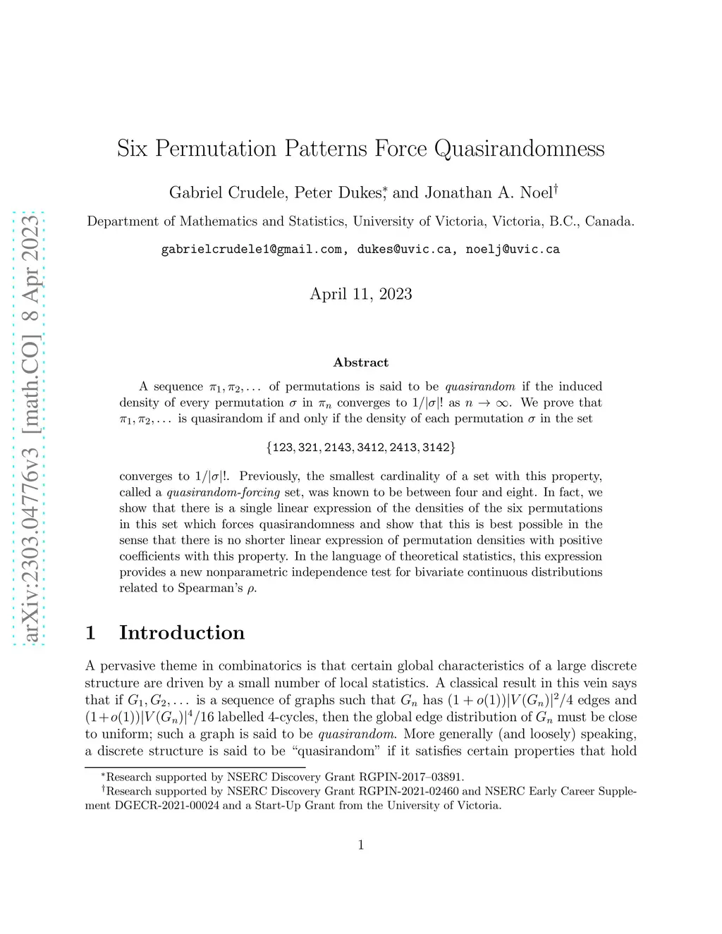 A sequence of permutations is said to be "quasirandom" if the induced density of every permutation in converges to as . We prove that is quasirandom if and only if the density of each permutation in the set converges to . Previously, the smallest cardinality of a set with this property, called a "quasirandom-forcing" set, was known to be between four and eight. In fact, we show that there is a single linear expression of the densities of the six permutations in this set which forces quasirandomness and show that this is best possible in the sense that there is no shorter linear expression of permutation densities with positive coefficients with this property. In the language of theoretical statistics, this expression provides a new nonparametric independence test for bivariate continuous distributions related to Spearman's .