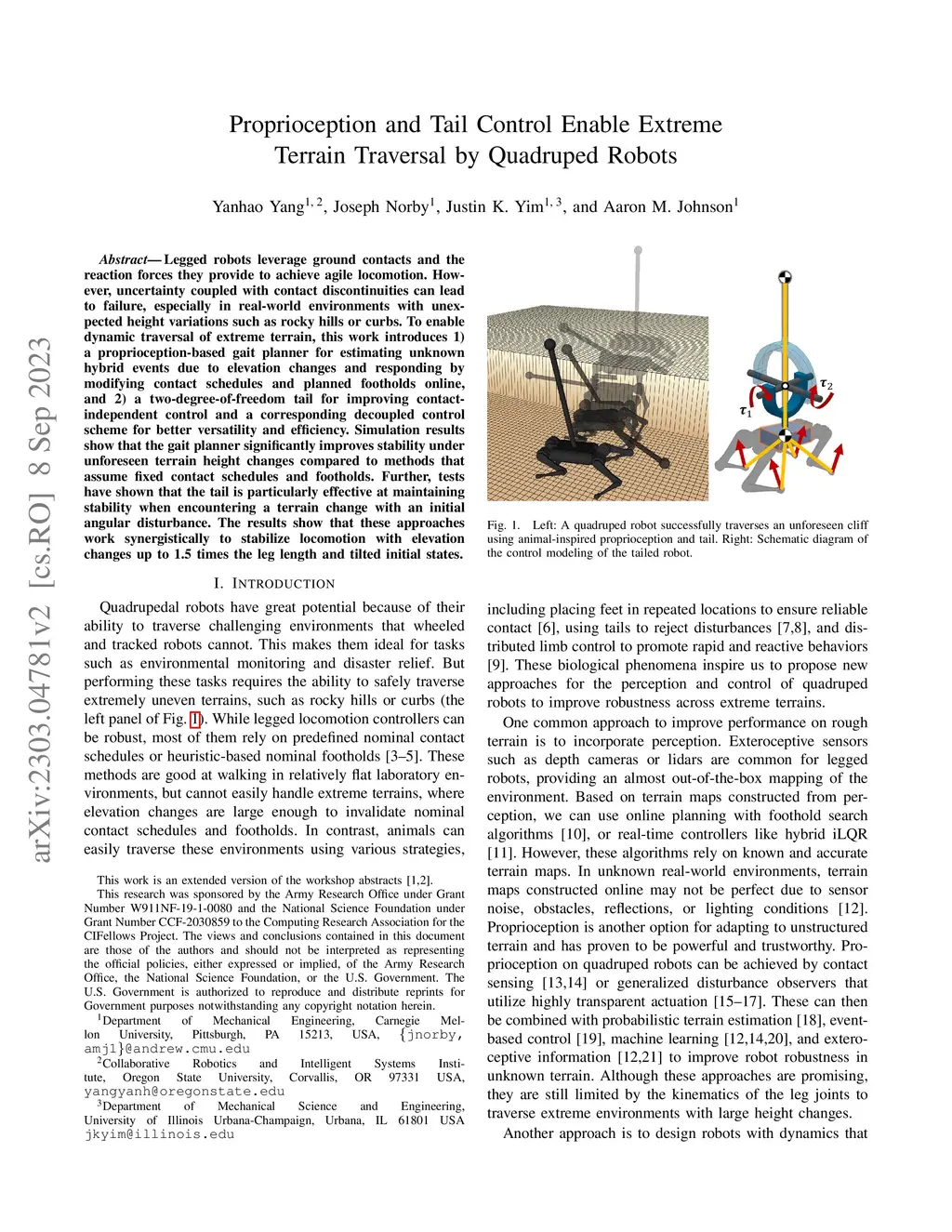 Legged robots leverage ground contacts and the reaction forces they provide to achieve agile locomotion. However, uncertainty coupled with contact discontinuities can lead to failure, especially in real-world environments with unexpected height variations such as rocky hills or curbs. To enable dynamic traversal of extreme terrain, this work introduces 1) a proprioception-based gait planner for estimating unknown hybrid events due to elevation changes and responding by modifying contact schedules and planned footholds online, and 2) a two-degree-of-freedom tail for improving contact-independent control and a corresponding decoupled control scheme for better versatility and efficiency. Simulation results show that the gait planner significantly improves stability under unforeseen terrain height changes compared to methods that assume fixed contact schedules and footholds. Further, tests have shown that the tail is particularly effective at maintaining stability when encountering a terrain change with an initial angular disturbance. The results show that these approaches work synergistically to stabilize locomotion with elevation changes up to 1.5 times the leg length and tilted initial states.
