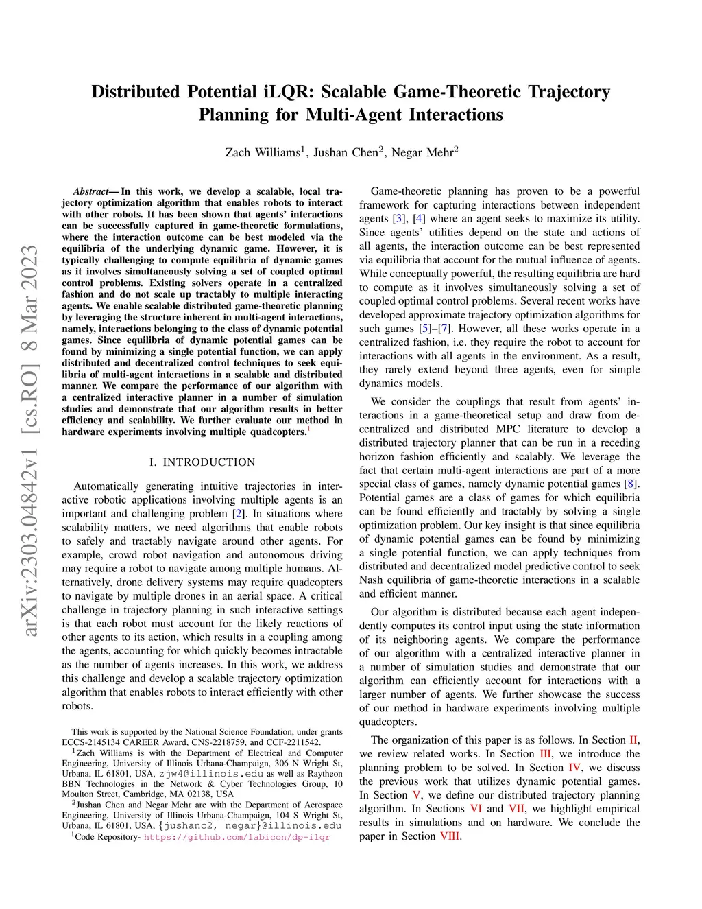 In this work, we develop a scalable, local trajectory optimization algorithm that enables robots to interact with other robots. It has been shown that agents' interactions can be successfully captured in game-theoretic formulations, where the interaction outcome can be best modeled via the equilibria of the underlying dynamic game. However, it is typically challenging to compute equilibria of dynamic games as it involves simultaneously solving a set of coupled optimal control problems. Existing solvers operate in a centralized fashion and do not scale up tractably to multiple interacting agents. We enable scalable distributed game-theoretic planning by leveraging the structure inherent in multi-agent interactions, namely, interactions belonging to the class of dynamic potential games. Since equilibria of dynamic potential games can be found by minimizing a single potential function, we can apply distributed and decentralized control techniques to seek equilibria of multi-agent interactions in a scalable and distributed manner. We compare the performance of our algorithm with a centralized interactive planner in a number of simulation studies and demonstrate that our algorithm results in better efficiency and scalability. We further evaluate our method in hardware experiments involving multiple quadcopters.