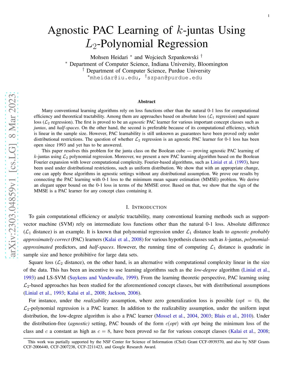 Many conventional learning algorithms rely on loss functions other than the natural 0-1 loss for computational efficiency and theoretical tractability. Among them are approaches based on absolute loss (L1 regression) and square loss (L2 regression). The first is proved to be an \textit{agnostic} PAC learner for various important concept classes such as \textit{juntas}, and \textit{half-spaces}. On the other hand, the second is preferable because of its computational efficiency, which is linear in the sample size. However, PAC learnability is still unknown as guarantees have been proved only under distributional restrictions. The question of whether L2 regression is an agnostic PAC learner for 0-1 loss has been open since 1993 and yet has to be answered. This paper resolves this problem for the junta class on the Boolean cube -- proving agnostic PAC learning of k-juntas using L2 polynomial regression. Moreover, we present a new PAC learning algorithm based on the Boolean Fourier expansion with lower computational complexity. Fourier-based algorithms, such as Linial et al. (1993), have been used under distributional restrictions, such as uniform distribution. We show that with an appropriate change, one can apply those algorithms in agnostic settings without any distributional assumption. We prove our results by connecting the PAC learning with 0-1 loss to the minimum mean square estimation (MMSE) problem. We derive an elegant upper bound on the 0-1 loss in terms of the MMSE error and show that the sign of the MMSE is a PAC learner for any concept class containing it.