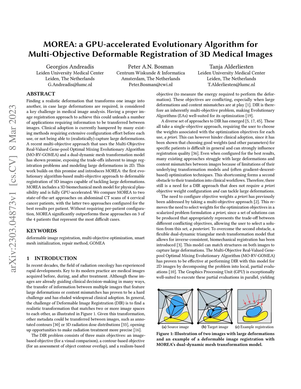 Finding a realistic deformation that transforms one image into another, in case large deformations are required, is considered a key challenge in medical image analysis. Having a proper image registration approach to achieve this could unleash a number of applications requiring information to be transferred between images. Clinical adoption is currently hampered by many existing methods requiring extensive configuration effort before each use, or not being able to (realistically) capture large deformations. A recent multi-objective approach that uses the Multi-Objective Real-Valued Gene-pool Optimal Mixing Evolutionary Algorithm (MO-RV-GOMEA) and a dual-dynamic mesh transformation model has shown promise, exposing the trade-offs inherent to image registration problems and modeling large deformations in 2D. This work builds on this promise and introduces MOREA: the first evolutionary algorithm-based multi-objective approach to deformable registration of 3D images capable of tackling large deformations. MOREA includes a 3D biomechanical mesh model for physical plausibility and is fully GPU-accelerated. We compare MOREA to two state-of-the-art approaches on abdominal CT scans of 4 cervical cancer patients, with the latter two approaches configured for the best results per patient. Without requiring per-patient configuration, MOREA significantly outperforms these approaches on 3 of the 4 patients that represent the most difficult cases.