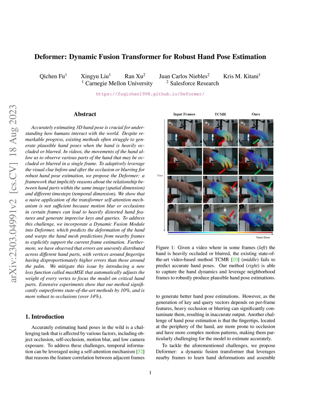 Accurately estimating 3D hand pose is crucial for understanding how humans interact with the world. Despite remarkable progress, existing methods often struggle to generate plausible hand poses when the hand is heavily occluded or blurred. In videos, the movements of the hand allow us to observe various parts of the hand that may be occluded or blurred in a single frame. To adaptively leverage the visual clue before and after the occlusion or blurring for robust hand pose estimation, we propose the Deformer: a framework that implicitly reasons about the relationship between hand parts within the same image (spatial dimension) and different timesteps (temporal dimension). We show that a naive application of the transformer self-attention mechanism is not sufficient because motion blur or occlusions in certain frames can lead to heavily distorted hand features and generate imprecise keys and queries. To address this challenge, we incorporate a Dynamic Fusion Module into Deformer, which predicts the deformation of the hand and warps the hand mesh predictions from nearby frames to explicitly support the current frame estimation. Furthermore, we have observed that errors are unevenly distributed across different hand parts, with vertices around fingertips having disproportionately higher errors than those around the palm. We mitigate this issue by introducing a new loss function called maxMSE that automatically adjusts the weight of every vertex to focus the model on critical hand parts. Extensive experiments show that our method significantly outperforms state-of-the-art methods by 10%, and is more robust to occlusions (over 14%).