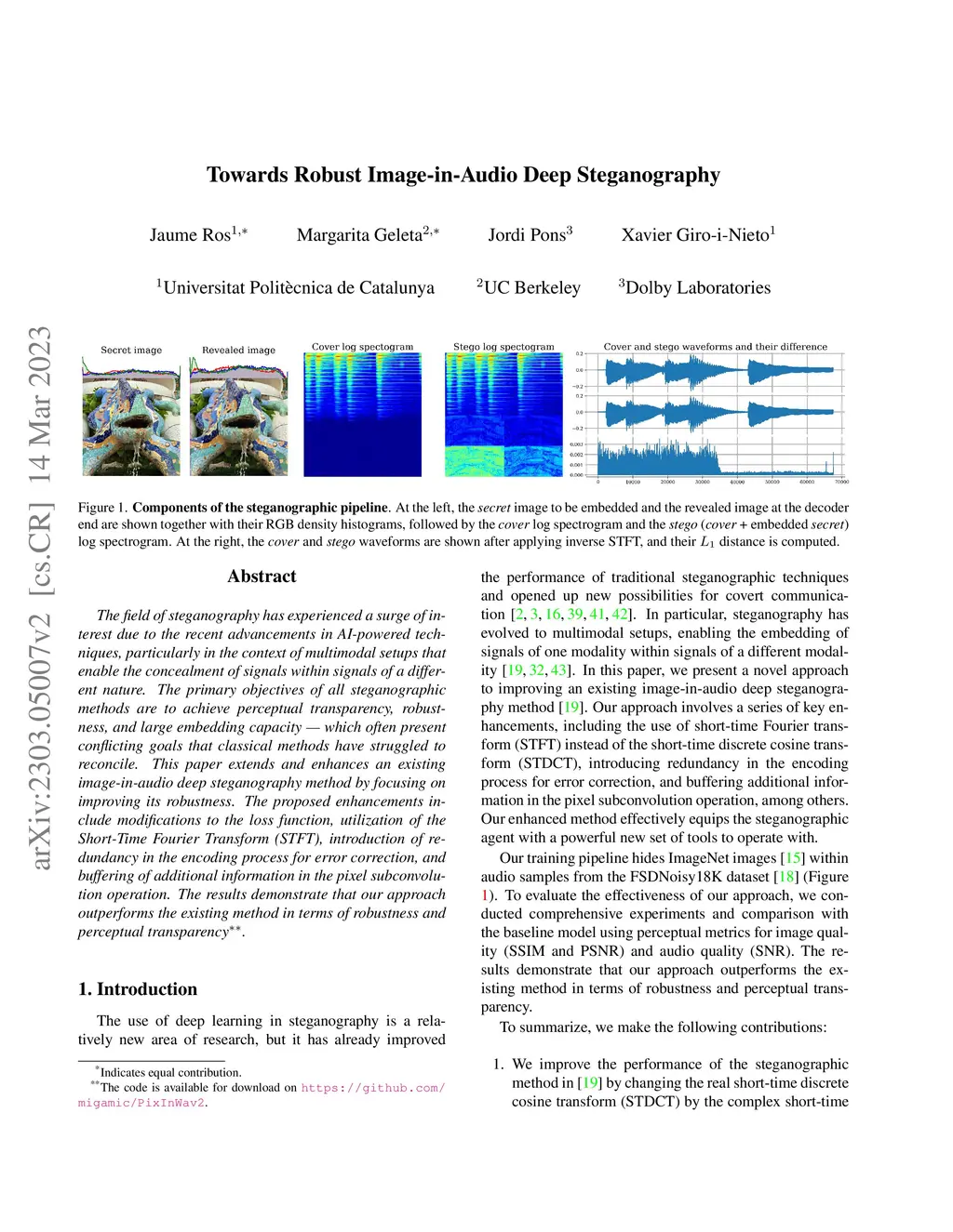 The field of steganography has experienced a surge of interest due to the recent advancements in AI-powered techniques, particularly in the context of multimodal setups that enable the concealment of signals within signals of a different nature. The primary objectives of all steganographic methods are to achieve perceptual transparency, robustness, and large embedding capacity - which often present conflicting goals that classical methods have struggled to reconcile. This paper extends and enhances an existing image-in-audio deep steganography method by focusing on improving its robustness. The proposed enhancements include modifications to the loss function, utilization of the Short-Time Fourier Transform (STFT), introduction of redundancy in the encoding process for error correction, and buffering of additional information in the pixel subconvolution operation. The results demonstrate that our approach outperforms the existing method in terms of robustness and perceptual transparency.