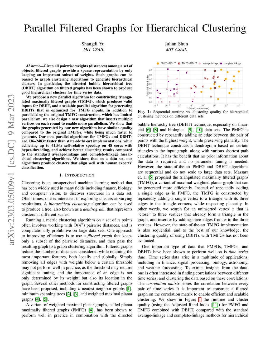 Given all pairwise weights (distances) among a set of objects, filtered graphs provide a sparse representation by only keeping an important subset of weights. Such graphs can be passed to graph clustering algorithms to generate hierarchical clusters. In particular, the directed bubble hierarchical tree (DBHT) algorithm on filtered graphs has been shown to produce good hierarchical clusters for time series data. We propose a new parallel algorithm for constructing triangulated maximally filtered graphs (TMFG), which produces valid inputs for DBHT, and a scalable parallel algorithm for generating DBHTs that is optimized for TMFG inputs. In addition to parallelizing the original TMFG construction, which has limited parallelism, we also design a new algorithm that inserts multiple vertices on each round to enable more parallelism. We show that the graphs generated by our new algorithm have similar quality compared to the original TMFGs, while being much faster to generate. Our new parallel algorithms for TMFGs and DBHTs are 136--2483x faster than state-of-the-art implementations, while achieving up to 41.56x self-relative speedup on 48 cores with hyper-threading, and achieve better clustering results compared to the standard average-linkage and complete-linkage hierarchical clustering algorithms. We show that on a stock data set, our algorithms produce clusters that align well with human experts' classification.