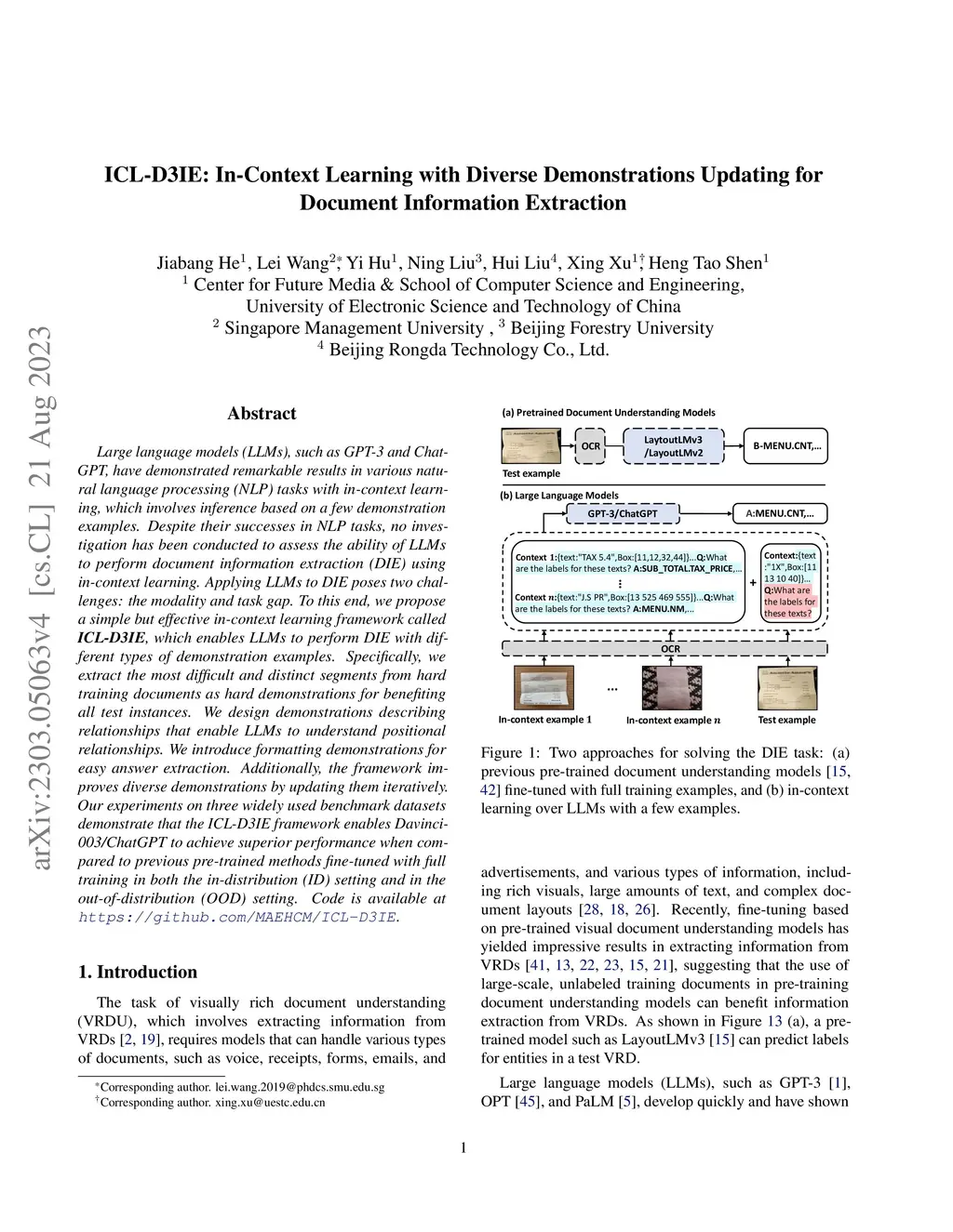 Large language models (LLMs), such as GPT-3 and ChatGPT, have demonstrated remarkable results in various natural language processing (NLP) tasks with in-context learning, which involves inference based on a few demonstration examples. Despite their successes in NLP tasks, no investigation has been conducted to assess the ability of LLMs to perform document information extraction (DIE) using in-context learning. Applying LLMs to DIE poses two challenges: the modality and task gap. To this end, we propose a simple but effective in-context learning framework called ICL-D3IE, which enables LLMs to perform DIE with different types of demonstration examples. Specifically, we extract the most difficult and distinct segments from hard training documents as hard demonstrations for benefiting all test instances. We design demonstrations describing relationships that enable LLMs to understand positional relationships. We introduce formatting demonstrations for easy answer extraction. Additionally, the framework improves diverse demonstrations by updating them iteratively. Our experiments on three widely used benchmark datasets demonstrate that the ICL-D3IE framework enables Davinci-003/ChatGPT to achieve superior performance when compared to previous pre-trained methods fine-tuned with full training in both the in-distribution (ID) setting and in the out-of-distribution (OOD) setting. Code is available at https://github.com/MAEHCM/ICL-D3IE.