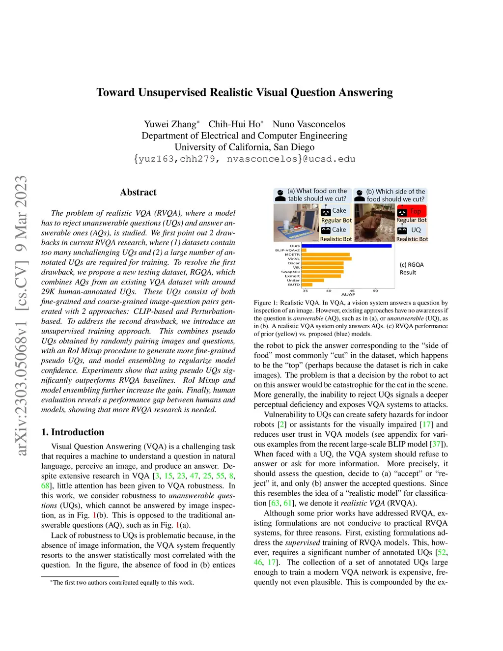 The problem of realistic VQA (RVQA), where a model has to reject unanswerable questions (UQs) and answer answerable ones (AQs), is studied. We first point out 2 drawbacks in current RVQA research, where (1) datasets contain too many unchallenging UQs and (2) a large number of annotated UQs are required for training. To resolve the first drawback, we propose a new testing dataset, RGQA, which combines AQs from an existing VQA dataset with around 29K human-annotated UQs. These UQs consist of both fine-grained and coarse-grained image-question pairs generated with 2 approaches: CLIP-based and Perturbation-based. To address the second drawback, we introduce an unsupervised training approach. This combines pseudo UQs obtained by randomly pairing images and questions, with an RoI Mixup procedure to generate more fine-grained pseudo UQs, and model ensembling to regularize model confidence. Experiments show that using pseudo UQs significantly outperforms RVQA baselines. RoI Mixup and model ensembling further increase the gain. Finally, human evaluation reveals a performance gap between humans and models, showing that more RVQA research is needed.