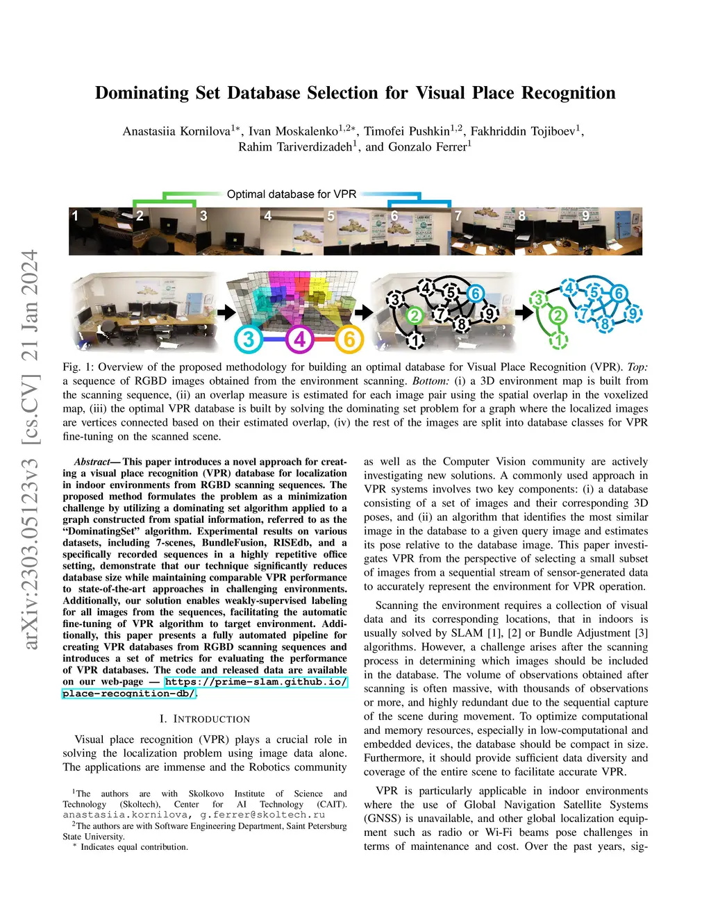 This paper presents an approach for creating a visual place recognition (VPR) database for localization in indoor environments from RGBD scanning sequences. The proposed approach is formulated as a minimization problem in terms of dominating set algorithm for graph, constructed from spatial information, and referred as DominatingSet. Our algorithm shows better scene coverage in comparison to other methodologies that are used for database creation. Also, we demonstrate that using DominatingSet, a database size could be up to 250-1400 times smaller than the original scanning sequence while maintaining a recall rate of more than 80% on testing sequences. We evaluated our algorithm on 7-scenes and BundleFusion datasets and an additionally recorded sequence in a highly repetitive office setting. In addition, the database selection can produce weakly-supervised labels for fine-tuning neural place recognition algorithms to particular settings, improving even more their accuracy. The paper also presents a fully automated pipeline for VPR database creation from RGBD scanning sequences, as well as a set of metrics for VPR database evaluation. The code and released data are available on our web-page~ -- https://prime-slam.github.io/place-recognition-db/