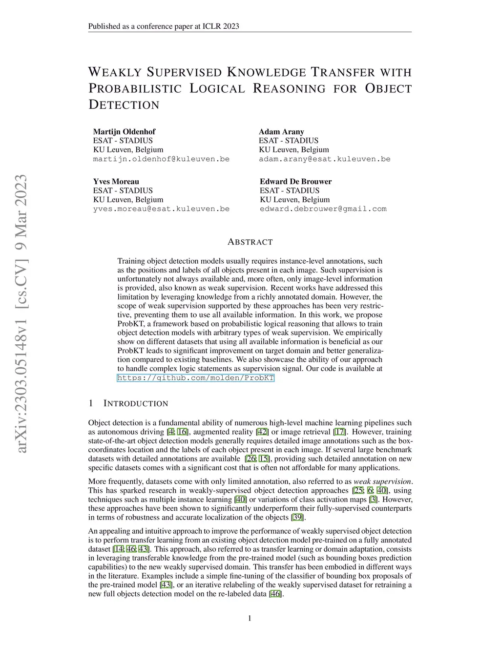 Training object detection models usually requires instance-level annotations, such as the positions and labels of all objects present in each image. Such supervision is unfortunately not always available and, more often, only image-level information is provided, also known as weak supervision. Recent works have addressed this limitation by leveraging knowledge from a richly annotated domain. However, the scope of weak supervision supported by these approaches has been very restrictive, preventing them to use all available information. In this work, we propose ProbKT, a framework based on probabilistic logical reasoning that allows to train object detection models with arbitrary types of weak supervision. We empirically show on different datasets that using all available information is beneficial as our ProbKT leads to significant improvement on target domain and better generalization compared to existing baselines. We also showcase the ability of our approach to handle complex logic statements as supervision signal.