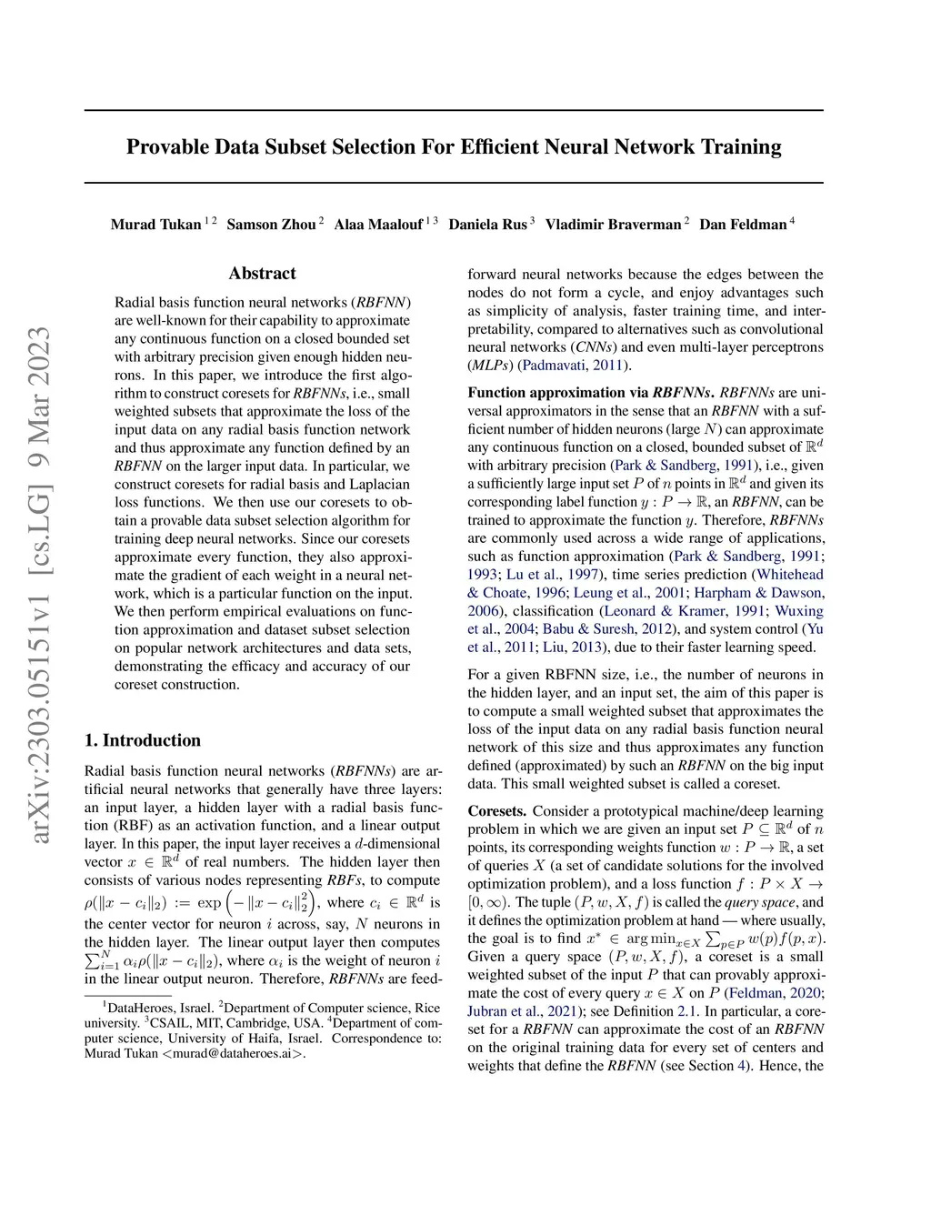 Radial basis function neural networks (\emph{RBFNN}) are {well-known} for their capability to approximate any continuous function on a closed bounded set with arbitrary precision given enough hidden neurons. In this paper, we introduce the first algorithm to construct coresets for \emph{RBFNNs}, i.e., small weighted subsets that approximate the loss of the input data on any radial basis function network and thus approximate any function defined by an \emph{RBFNN} on the larger input data. In particular, we construct coresets for radial basis and Laplacian loss functions. We then use our coresets to obtain a provable data subset selection algorithm for training deep neural networks. Since our coresets approximate every function, they also approximate the gradient of each weight in a neural network, which is a particular function on the input. We then perform empirical evaluations on function approximation and dataset subset selection on popular network architectures and data sets, demonstrating the efficacy and accuracy of our coreset construction.