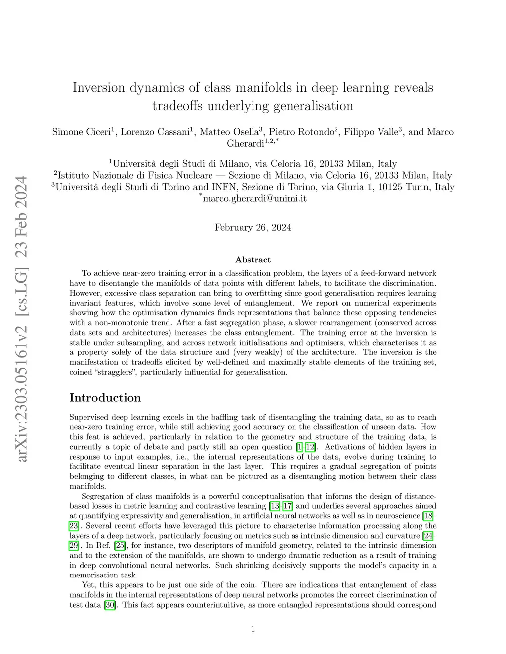 To achieve near-zero training error in a classification problem, the layers of a feed-forward network have to disentangle the manifolds of data points with different labels, to facilitate the discrimination. However, excessive class separation can bring to overfitting since good generalisation requires learning invariant features, which involve some level of entanglement. We report on numerical experiments showing how the optimisation dynamics finds representations that balance these opposing tendencies with a non-monotonic trend. After a fast segregation phase, a slower rearrangement (conserved across data sets and architectures) increases the class entanglement.The training error at the inversion is stable under subsampling, and across network initialisations and optimisers, which characterises it as a property solely of the data structure and (very weakly) of the architecture. The inversion is the manifestation of tradeoffs elicited by well-defined and maximally stable elements of the training set, coined ``stragglers'', particularly influential for generalisation.